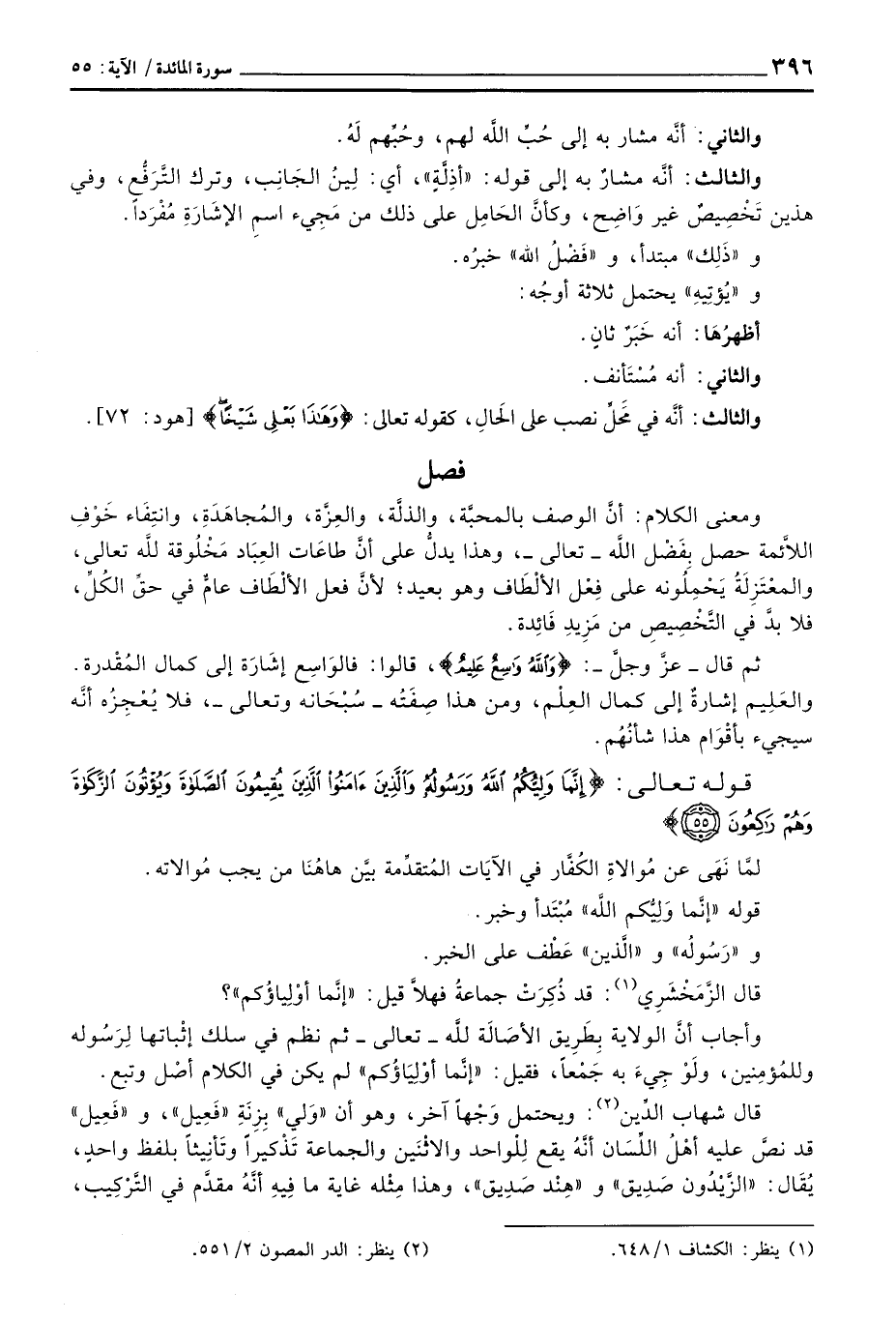 ومعنى الكلام: أنَّ الوصف بالمحبَّة، والذلَّة، والعِزَّة، والمُجاهَدَةِ، وانتِفَاء خَوْفِ اللاَّئمة حصل بِفَضْل اللَّه - تعالى -، وهذا يدلُّ على أنَّ طاعَات العِبَاد مَخْلُوقة للَّه تعالى، والمعْتَزِلَةُ يَحْمِلُونه على فِعْل الألْطَاف وهو بعيد؛ لأنَّ فعل الألْطَاف عامٌّ في حقِّ الكُلِّ، فلا بدَّ في التَّخْصِيصِ من مَزِيدِ فَائِدة.