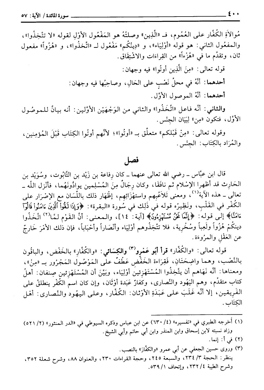 قوله تعالى: «والكُفَّار» قرأ أبُو عَمْرو والكِسَائي: «والكُفَّارِ» بالخَفْض، والباقُون بالنَّصْب، وهما واضِحَتَانِ، فَقِرَاءة الخَفْضِ عَطْفٌ على المَوْصُول المَجْرُور ب «مِنْ» ، ومعناها: أنَّه نَهَاهم أن يتَّخِذُوا المُسْتَهْزِئين أوْلِيَاء، وبَيَّنَ أن المُسْتَهْزِئين صِنفان: أهلُ كتاب متقدِّم، وهم اليَهُود والنَّصارى، وكفارٌ عَبَدة أوْثَان، وإن كان اسم الكُفْر ينطلقُ على الفَرِيقين، إلا أنَّه غَلَبَ على عَبَدَةِ الأوْثان: الكُفَّار، وعلى اليهُود والنَّصارى: أهْل الكِتَاب.