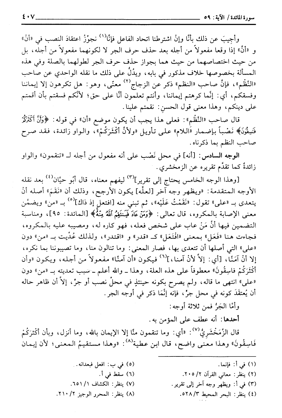 [وهذا الوجه الخامس يحتاج إلى تقرير] ليفهم معناه، قال أبُو حيَّان بعد نقله الأوجه المتقدمة: «ويظهر وجه آخر [لعلَّه] يكون الأرجح، وذلك أن» نَقَمَ «أصله أنْ يتعدى ب» على «تقول:» نَقَمْتُ عَلَيْه «، ثم تبني منه [افتعل إذ ذاك] ب» من «ويضمَّن معنى الإصابة بالمكروه، قال تعالى: {وَمَنْ عَادَ فَيَنْتَقِمُ الله مِنْهُ} [المائدة: 95] ، ومناسبة التضمين فيها أنَّ مَنْ عاب على شخص فعله، فهو كاره له، ومصيبه عليه بالمكروه، فجاءت هنا» فَعَل «بمعنى» افْتَعَل «ك» قدر «و» اقتدر «، ولذلك عُدِّيت ب» من «دون» على «التي أصلها أن تتعدى بها، فصار المعنى: وما تنالون منا، وما تصيبوننا بما نكره، إلا أنْ آمَنَّا، [أي: إلاَّ لأنْ آمنا،] فيكون» أن آمنَّا «مفعولاً من أجله، ويكون {وَأَنَّ أَكْثَرَكُمْ فَاسِقُونَ} معطوفاً على هذه العلة، وهذا - والله أعلم - سبب تعديته ب» من «دون» على «انتهى ما قاله، ولم يصرح بكون حينئذٍ في محلِّ نصب أو جرٍّ، إلاَّ أن ظاهر حاله أن يُعتقَدَ كونه في محل جرٍّ، فإنه إنَّمَا ذكر في أوجه الجر.