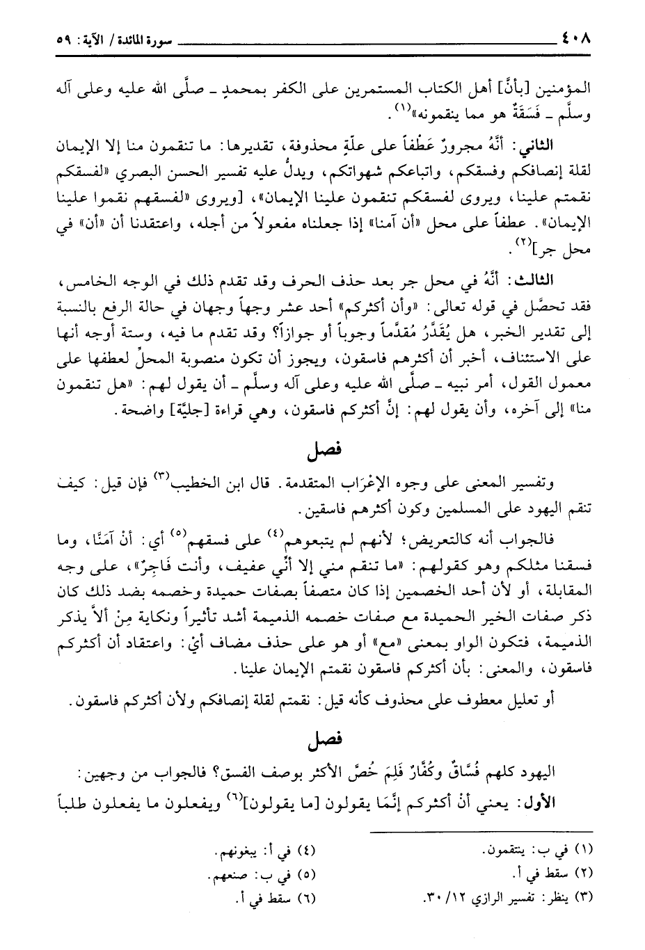 الثاني: أنَّهُ مجرورٌ عَطْفاً على علّةٍ محذوفة، تقديرها: ما تنقمون منا إلا الإيمان لقلة إنصافكم وفسقكم، واتباعكم شهواتكم، ويدلُّ عليه تفسير الحسن البصري» لفسقكم نقمتم علينا، ويروى لفسقكم تنقمون علينا الإيمان «، [ويروى» لفسقهم نقموا علينا الإيمان «. عطفاً على محل» أن آمنا «إذا جعلناه مفعولاً من أجله، واعتقدنا أن» أن «في محل جر] .