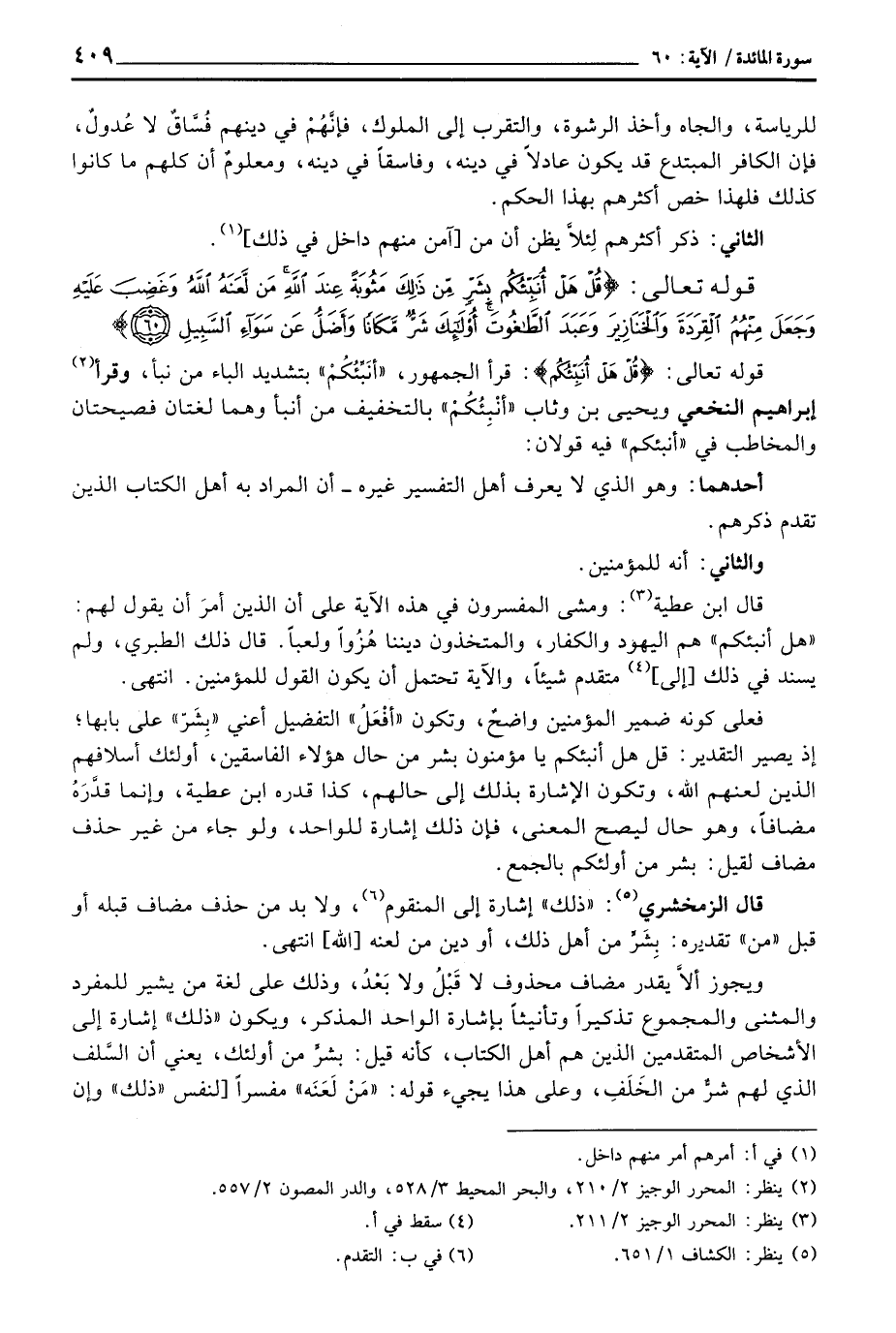 فعلى كونه ضمير المؤمنين واضحٌ، وتكون «أفْعَلُ» التفضيل أعني «بِشَرّ» على بابها؛ إذ يصير التقدير: قل هل أنبئكم يا مؤمنون بشر من حال هؤلاء الفاسقين، أولئك أسلافهم الذين لعنهم الله، وتكون الإشارة بذلك إلى حالهم، كذا قدره ابن عطية، وإنما قدَّرَهُ مضافاً، وهو حال ليصح المعنى، فإن ذلك إشارة للواحد، ولو جاء من غير حذف مضاف لقيل: بشر من أولئكم بالجمع.