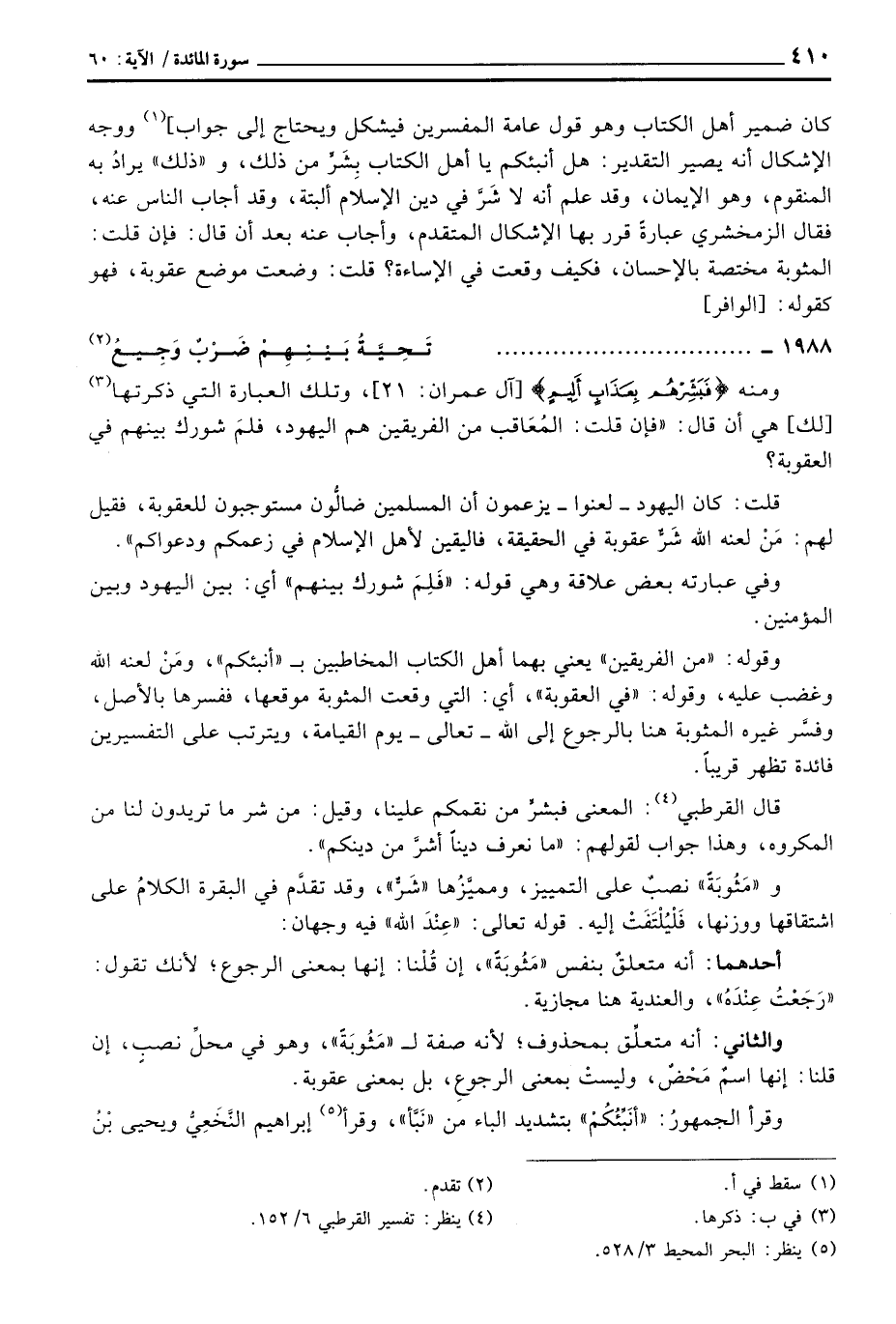 كان ضمير أهل الكتاب وهو قول عامة المفسرين فيشكل ويحتاج إلى جواب] ووجه الإشكال أنه يصير التقدير: هل أنبئكم يا أهل الكتاب بِشَرٍّ من ذلك، و «ذلك» يرادُ به المنقوم، وهو الإيمان، وقد علم أنه لا شَرَّ في دين الإسلام ألبتة، وقد أجاب الناس عنه، فقال الزمخشري عبارةً قرر بها الإشكال المتقدم، وأجاب عنه بعد أن قال: فإن قلت: المثوبة مختصة بالإحسان، فكيف وقعت في الإساءة؟ قلت: وضعت موضع عقوبة، فهو كقوله: [الوافر]