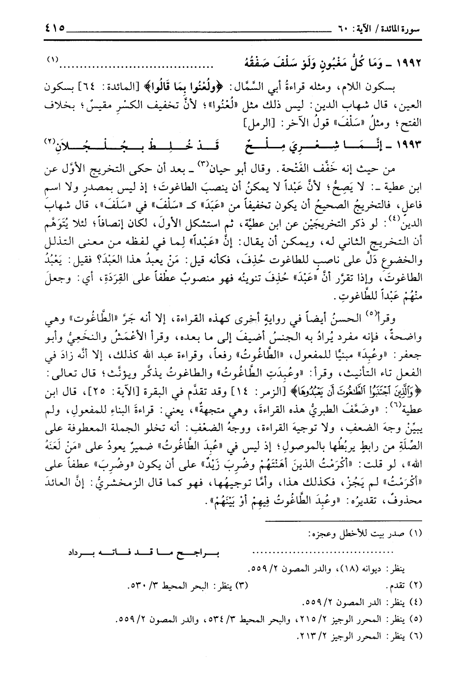 من حيث إنه خَفَّف الفَتْحة. وقال أبو حيان - بعد أن حكى التخريج الأوَّل عن ابن عطية -: لا يَصِحُّ؛ لأنَّ عَبْداً لايمكنُ أن ينصبَ الطاغوتَ؛ إذ ليس بمصدرٍ ولا اسمِ فاعلٍ، فالتخريجُ الصحيحُ أن يكون تخفيفاً من «عَبَدَ» ك «سَلْفَ» في «سَلَفَ» ، قال شهاب الدين: لو ذكر التخريجَيْن عن ابن عطيَّة، ثم استشكل الأولَ، لكان إنصافاً؛ لئلا يُتَوَهَّم أن التخريج الثاني له، ويمكن أن يقال: إنَّ «عَبْداً» لِما في لفظه من معنى التذلل والخضوعِ دَلَّ على ناصبٍ للطاغوت حُذِفَ، فكأنه قيل: مَنْ يعبدُ هذا العَبْدَ؟ فقيل: يَعْبُدُ الطاغوتَ، وإذا تقرَّر أنَّ «عَبْدَ» حُذِفَ تنوينُه فهو منصوبٌ عطْفاً على القِردَةِ، أي: وجعلَ منْهُمْ عَبْداً للطَّاغوتِ.
