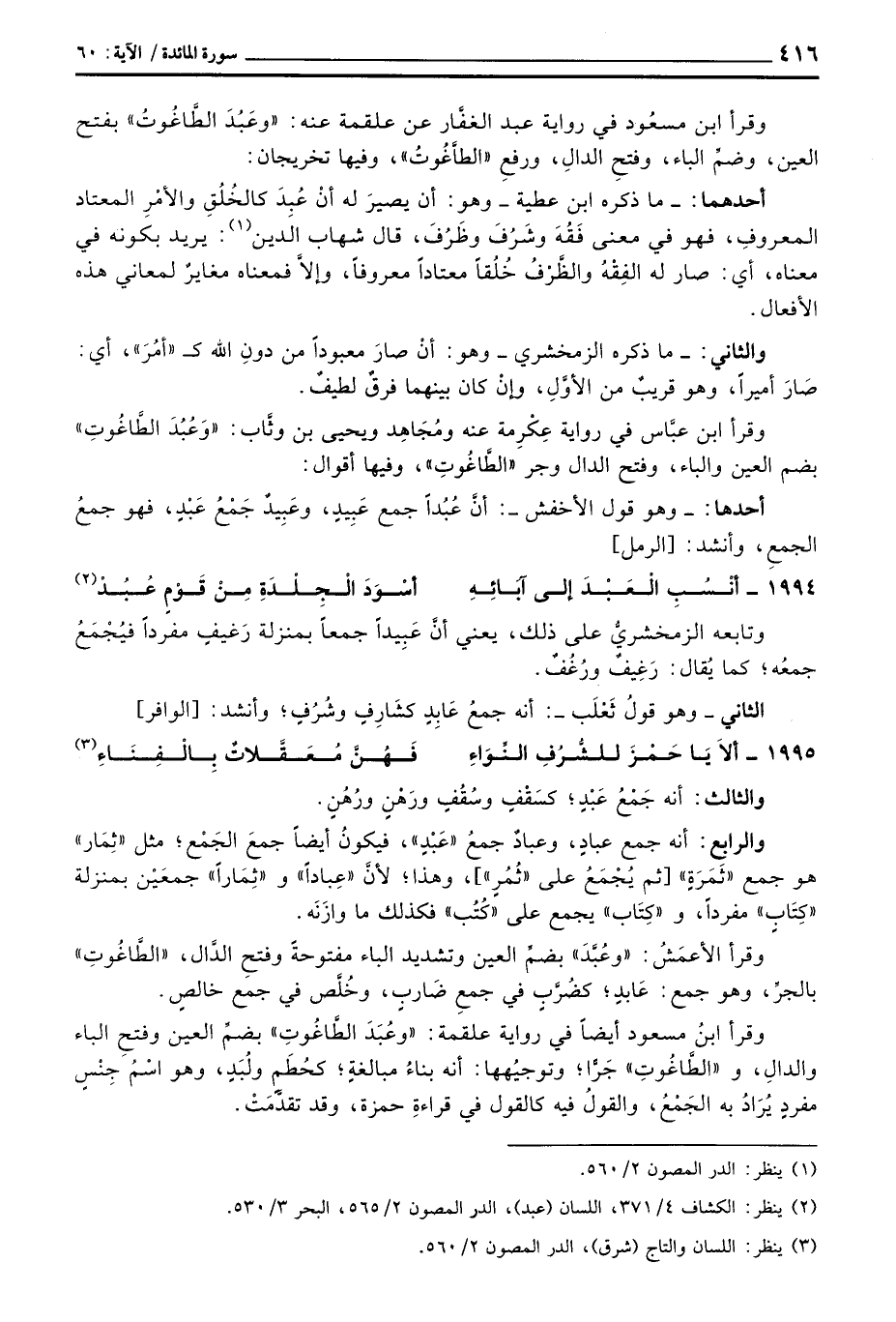 وقرأ ابن عبَّاس في رواية عِكْرِمة عنه ومُجَاهِد ويحيى بن وثَّاب: «وَعُبُدَ الطَّاغُوتِ» بضم العين والباء، وفتح الدال وجر «الطَّاغُوتِ» ، وفيها أقوال: