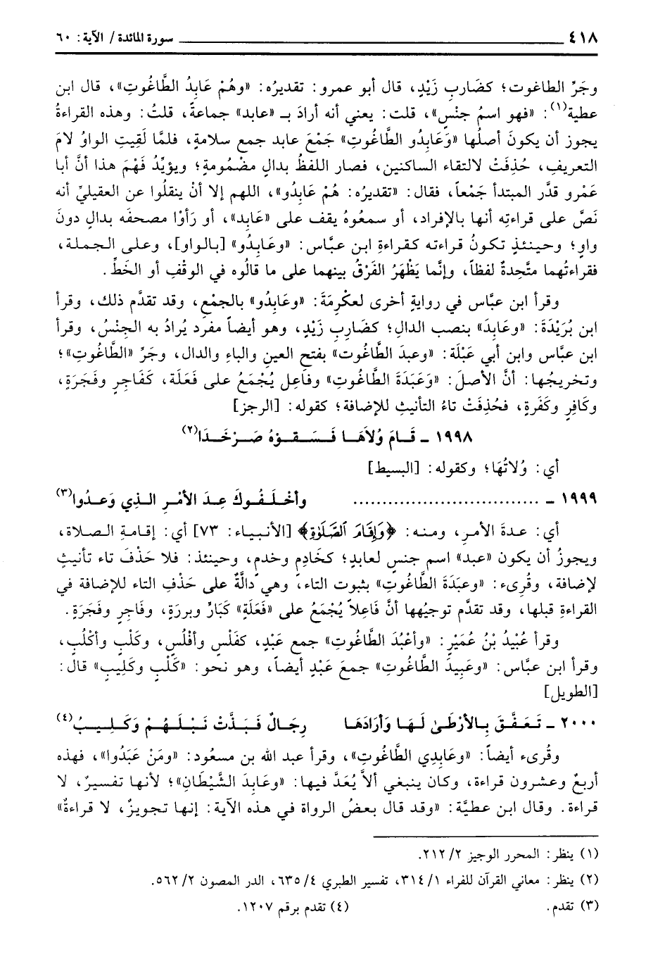 وقُرئ أيضاً: «وعَابِدِي الطَّاغُوتِ» ، وقرأ عبد الله بن مسعُود: «ومَنْ عَبَدُوا» ، فهذه أربعٌ وعشرون قراءة، وكان ينبغي ألاَّ يُعَدَّ فيها: «وعَابِدَ الشَّيْطَانِ» ؛ لأنها تفسيرٌ، لا قراءة. وقال ابن عطيَّة: «وقد قال بعضُ الرواة في هذه الآية: إنها تجويزٌ، لا قراءة»
