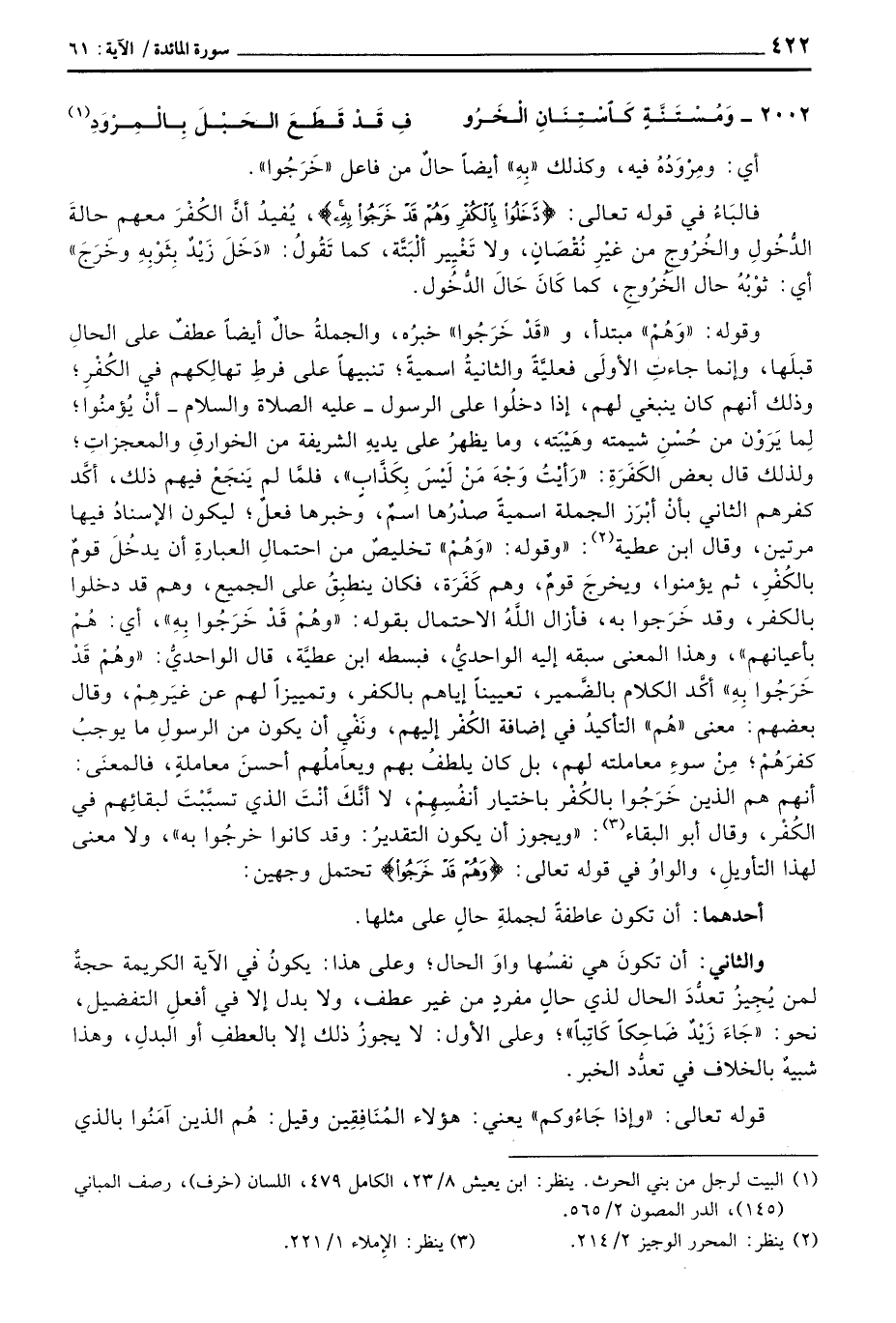 أي: ومِرْوَدُهُ فيه، وكذلك «بِهِ» أيضاً حالٌ من فاعل «خَرَجُوا» . فالبَاءُ في قوله تعالى: {دَّخَلُواْ بالكفر وَهُمْ قَدْ خَرَجُواْ بِهِ} ، يُفيدُ أنَّ الكُفْرَ معهم حالةَ الدُّخُولِ والخُرُوجِ من غيْرِ نُقْصَانٍ، ولا تَغْيِير ألْبَتَّة، كما تَقُولُ: «دَخَلَ زَيْدٌ بِثَوْبِهِ وخَرَجَ» أي: ثوْبُهُ حال الخُرُوجِ، كما كَانَ حَالَ الدُّخُول. وقوله: «وَهُمْ» مبتدأ، و «قَدْ خَرَجُوا» خبرُه، والجملةُ حالٌ أيضاً عطفٌ على الحالِ قبلَها، وإنما جاءتِ الأولَى فعليَّةً والثانيةُ اسميةً؛ تنبيهاً على فرطِ تهالِكهم في الكُفْرِ؛ وذلك أنهم كان ينبغي لهم، إذا دخلُوا على الرسول - عَلَيْهِ الصَّلَاة وَالسَّلَام ُ - أنْ يُؤمنُوا؛ لِما يَرَوْن من حُسْنِ شيمته وهَيْبَته، وما يظهرُ على يديهِ الشريفة من الخوارقِ والمعجزاتِ؛ ولذلك قال بعض الكَفَرَةِ: «رَأيْتُ وَجْهَ مَنْ لَيْسَ بِكَذَّابٍ» ، فلمَّا لم يَنجَعْ فيهم ذلك، أكَّد كفرهم الثاني بأنْ أبْرَز الجملة اسميةً صدْرُها اسمٌ، وخبرها فعلٌ؛ ليكون الإسنادُ فيها مرتين، وقال ابن عطية: «وقوله:» وَهُمْ «تخليصٌ من احتمالِ العبارةِ أن يدخُلَ قومٌ بالكُفْرِ، ثم يؤمنوا، ويخرجَ قومٌ، وهم كَفَرَة، فكان ينطبِقُ على الجميع، وهم قد دخلوا بالكفر، وقد خَرَجوا به، فأزال اللَّهُ الاحتمال بقوله: {وَهُمْ قَدْ خَرَجُواْ بِهِ} ، أي: هُمْ بأعيانهم» ، وهذا المعنى سبقه إليه الواحديُّ، فبسطه ابن عطيَّة، قال الواحديُّ: {وَهُمْ قَدْ خَرَجُواْ بِهِ} أكَّد الكلام بالضَّمير، تعييناً إياهم بالكفر، وتمييزاً لهم عن غيَرِهِمْ، وقال بعضهم: معنى «هُم» التأكيدُ في إضافة الكُفْر إليهم، ونَفْيِ أن يكون من الرسولِ ما يوجبُ كفرَهُمْ؛ مِنْ سوءِ معاملته لهم، بل كان يلطفُ بهم ويعاملُهم أحسنَ معاملةٍ، فالمعنَى: أنهم هم الذين خَرَجُوا بالكُفْر باختيار أنفُسِهِمْ، لا أنَّكَ أنْتَ الذي تسبَّبْتَ لبقائِهم في الكُفْر، وقال أبو البقاء: «ويجوز أن يكون التقديرُ: وقد كانوا خرجُوا به» ، ولا معنى لهذا التأويلِ، والواوُ في قوله تعالى: {وَهُمْ قَدْ خَرَجُواْ بِهِ} تحتمل وجهين: