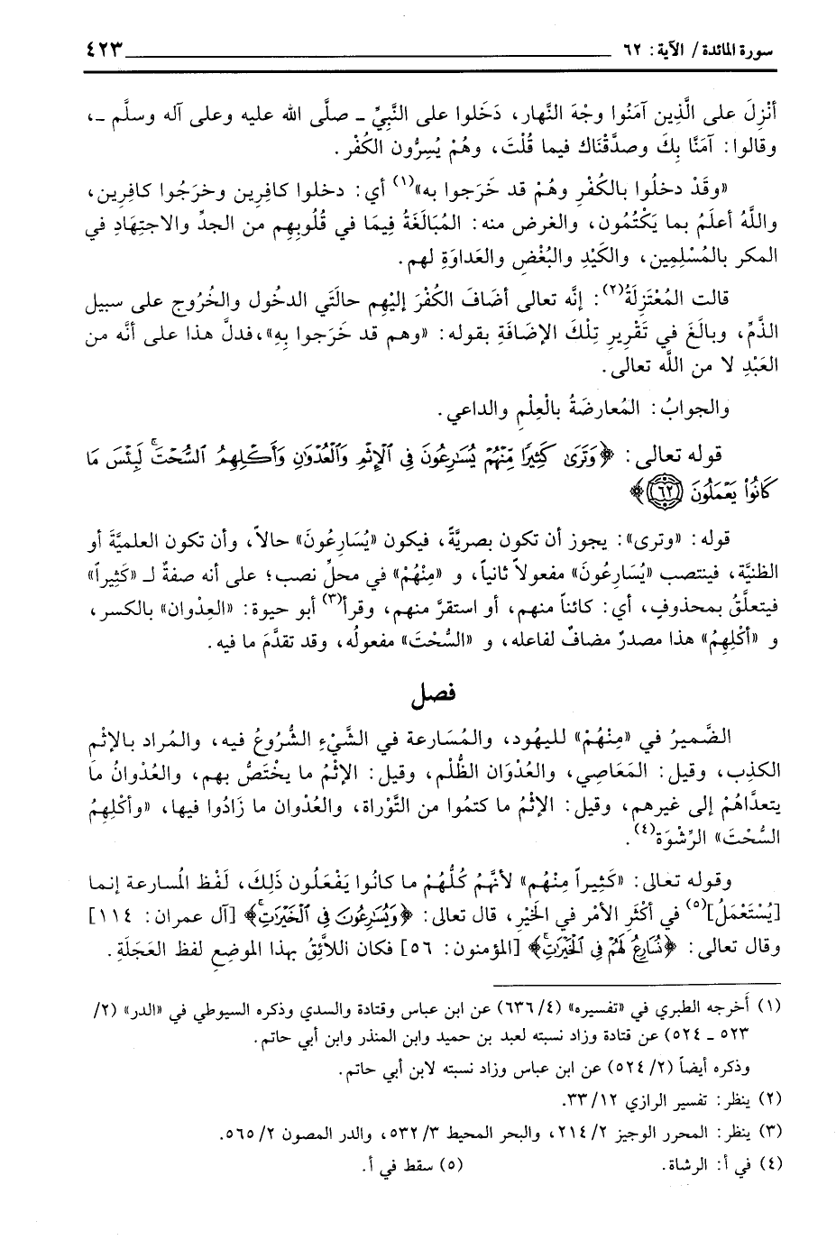 الضَّميرُ في «مِنْهُمْ» لليهُود، والمُسَارعة في الشَّيْءِ الشُّرُوعُ فيه، والمُراد بالإثْمِ الكذِب، وقيل: المَعَاصِي، والعُدْوَان الظُّلْم، وقيل: الإثْمُ ما يخْتَصُّ بهم، والعُدْوانُ ما يتعدَّاهُمْ إلى غيرهم، وقيل: الإثْمُ ما كتمُوا من التَّوْراة، والعُدْوان ما زَادُوا فيها، «وأكْلِهِمُ السُّحْتَ» الرِّشْوَة.