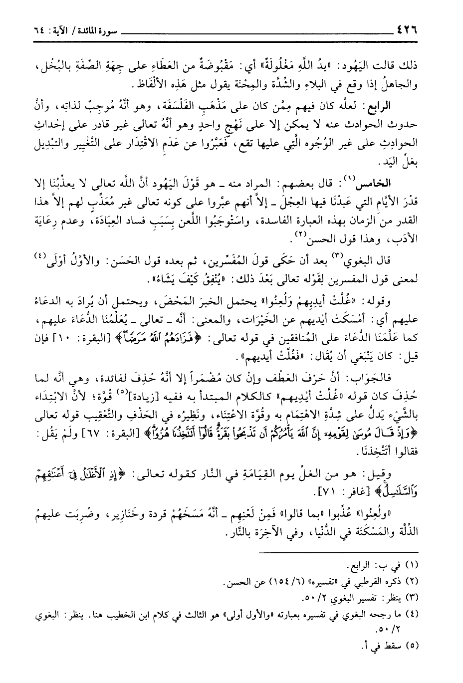 الرابع: لعلَّه كان فيهم مِمَّن كان على مَذْهَبِ الفَلْسَفَة، وهو أنَّهُ مُوجِبٌ لذاتِه، وأنَّ حدوث الحوادث عنه لا يمكن إلا على نَهْجٍ واحدٍ وهو أنَّهُ تعالى غير قادر على إحْداثِ الحوادِثِ على غير الوُجُوه الَّتِي عليها تقع، فَعَبَّرُوا عن عَدَمِ الاقْتِدَار على التَّغْيِير والتبْدِيل بغلِّ اليَد.