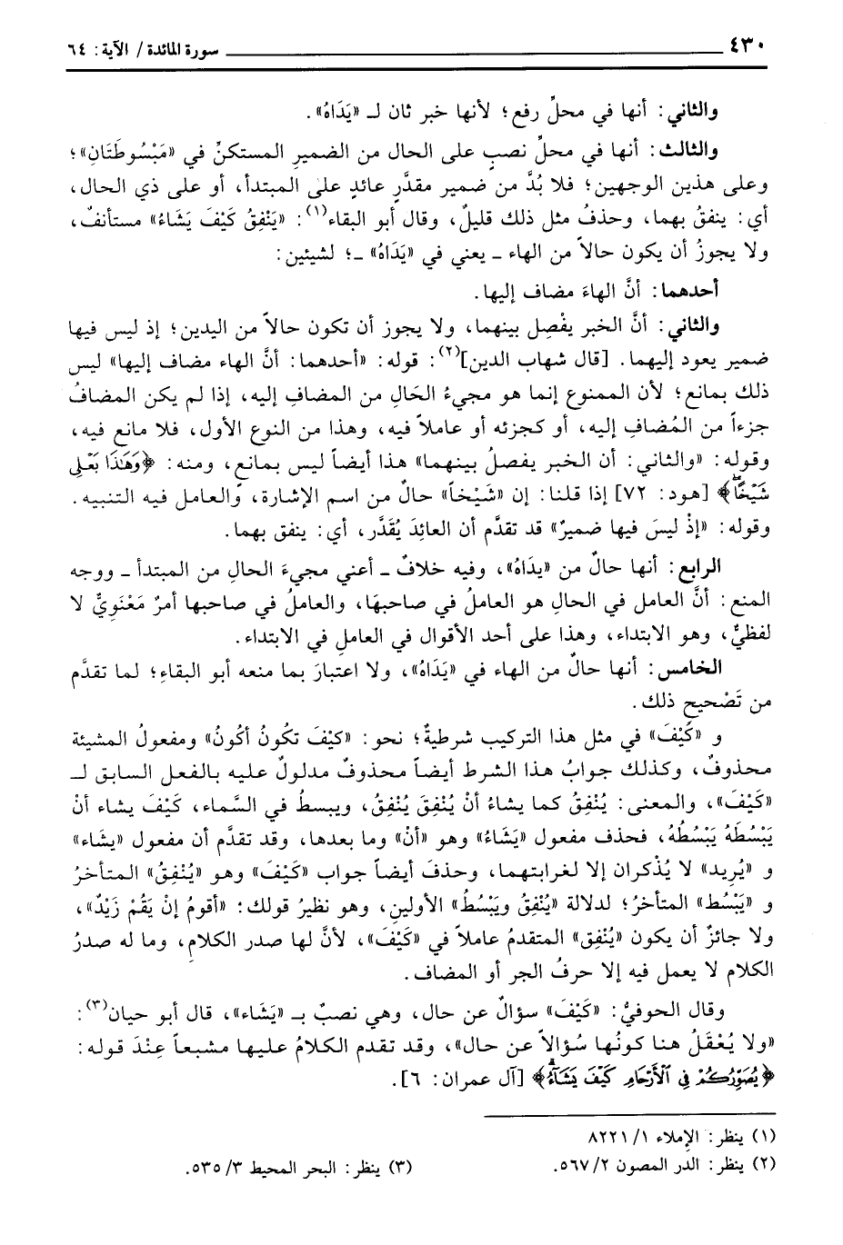 والثالث: أنها في محلِّ نصبٍ على الحال من الضميرِ المستكنِّ في «مَبْسُوطَتَانِ» ؛ وعلى هذين الوجهين؛ فلا بُدَّ من ضمير مقدَّرٍ عائدٍ على المبتدأ، أو على ذي الحال، أي: ينفقُ بهما، وحذفُ مثل ذلك قليلٌ، وقال أبو البقاء: {يُنفِقُ كَيْفَ يَشَآءُ} مستأنفٌ، ولا يجوزُ أن يكون حالاً من الهاء - يعني في «يَدَاهُ» -؛ لشيئين:
