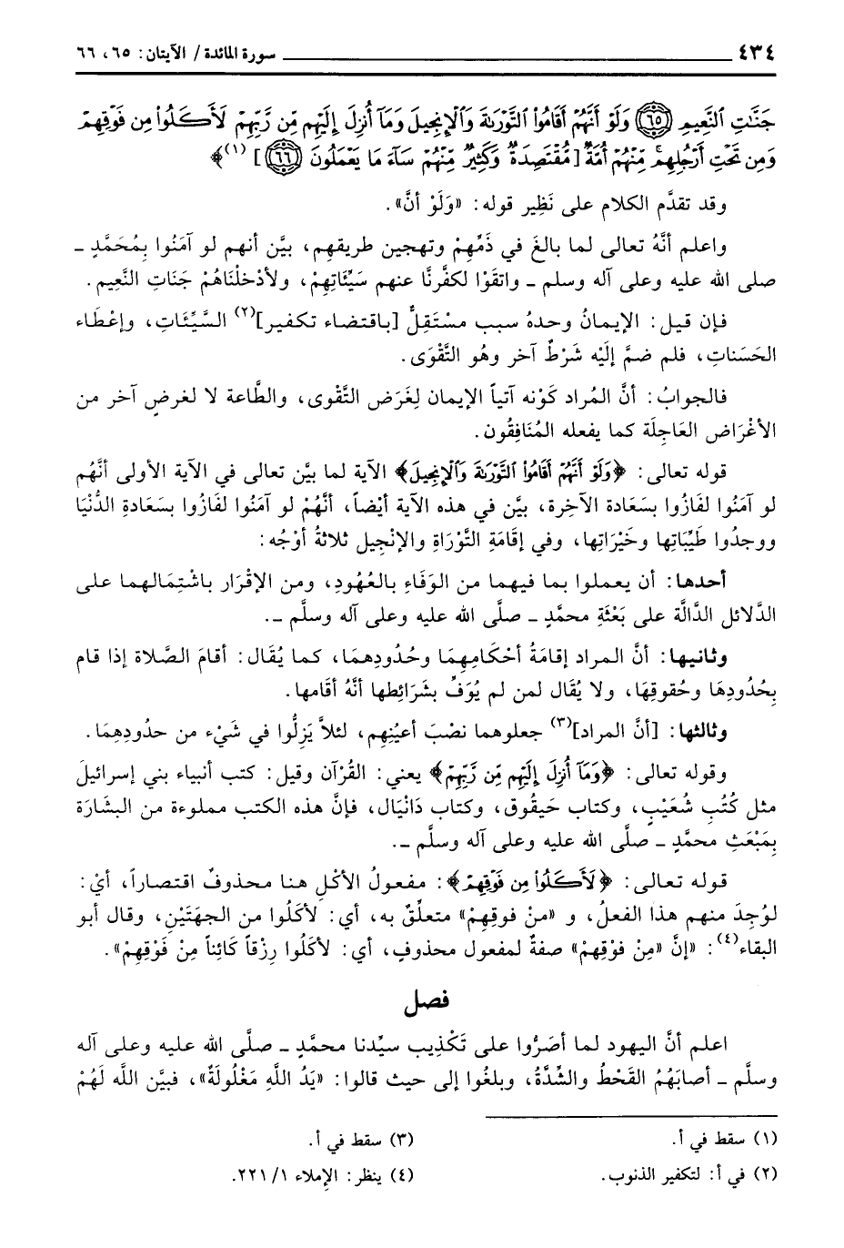 قوله تعالى: {وَلَوْ أَنَّهُمْ أَقَامُواْ التوراة والإنجيل} الآية لما بيَّن تعالى في الآية الأولى أنَّهُم لو آمَنُوا لفَازُوا بسَعَادة الآخِرة، بيَّن في هذه الآية أيْضاً، أنَّهُمْ لو آمَنُوا لفَازُوا بسَعَادةِ الدُّنْيَا ووجدُوا طَيِّبَاتِهَا وخَيْرَاتِها، وفي إقَامَةِ التَّوْرَاةِ والإنْجِيل ثلاثةُ أوْجُه: