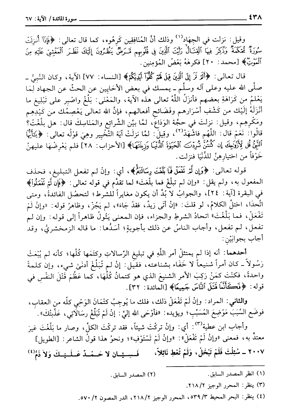 قال تعالى: {أَلَمْ تَرَ إِلَى الذين قِيلَ لَهُمْ كفوا أَيْدِيَكُمْ} [النساء: 77] الآية، وكان النَّبِيُّ - صلَّى الله عليه وعلى آله وسلَّم - يمسك في بعض الأحَايِين عن الحثِّ عن الجهاد لِمَا يَعْلمُ من كَرَاهَةِ بعضهم فأنزَلُ اللَّهُ تعالى هذه الآية، والمَعْنَى: بَلِّغْ واصْبِر على تَبْلِيغ ما أنْزَلَهُ إلَيْك من كَشْفِ أسْرَارهم وفَضَائحِ أفعالهم، فإنَّ الله تعالى يَعْصِمُك من كَيْدِهِم ومَكْرِهِم، وقيل: نزلتَ في حجَّة الوَدَاع، لمَّا بيَّن الشَّرائِع والمَنَاسِكَ قال: هل بلَّغْتُ؟ قالُوا: نَعَمْ قال: اللَّهُم فاشْهَدْ، وقِيلَ: لمَّا نزلَتْ آيَة التَّخْيِير وهِيَ قوْلُه تعالى: {ياأيها النبي قُل لأَزْوَاجِكَ إِن كُنتُنَّ تُرِدْنَ الحياة الدنيا وَزِينَتَهَا} [الأحزاب: 28] فلم يَعْرِضْهَا عليهنَّ خَوْفاً من اختيارِهِنَّ للدُّنْيَا فنزلت.