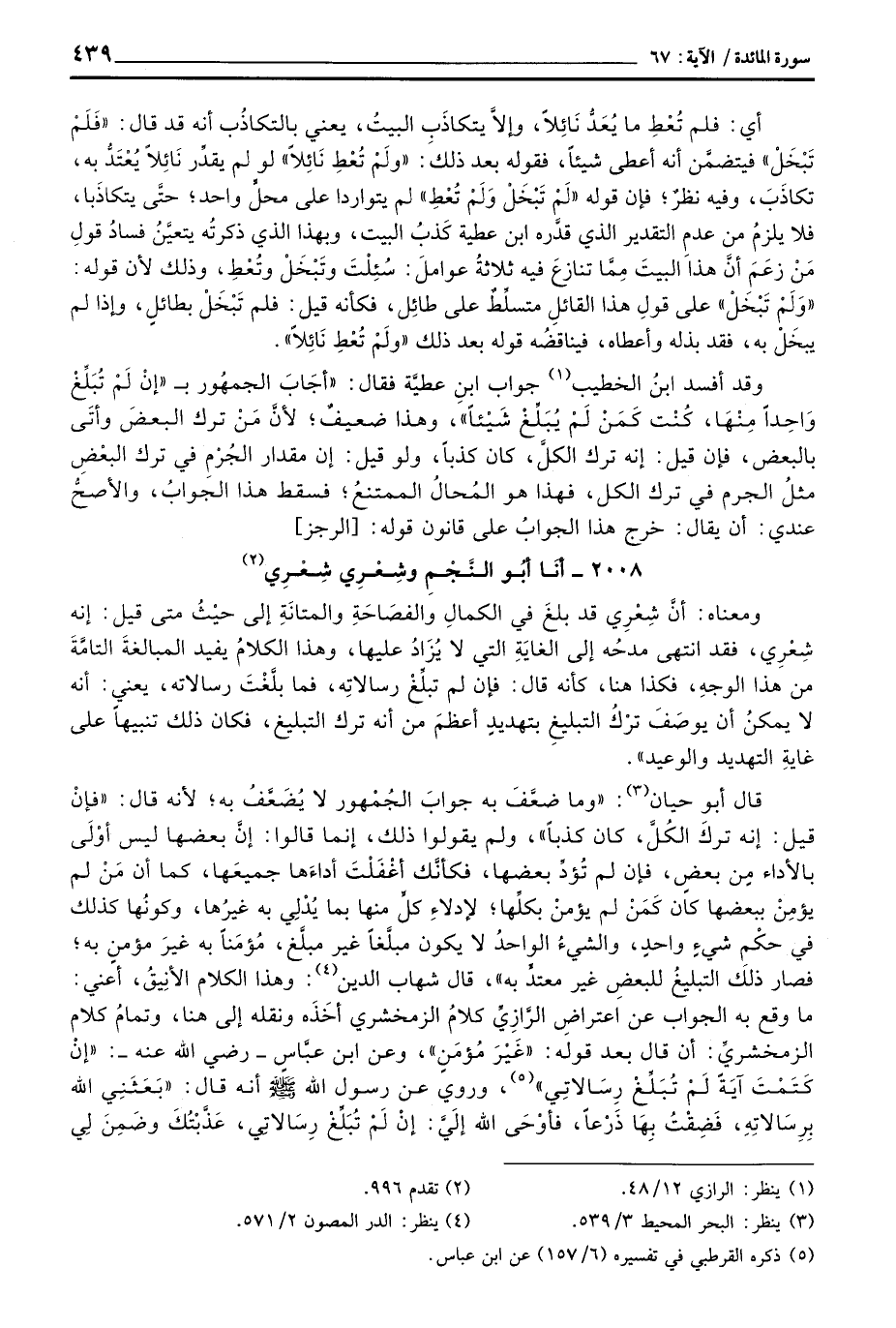 2008 - أنَا أبُو النَّجْمِ وشِعْرِي شِعْرِي ... ومعناه: أنَّ شِعْرِي قد بلغَ في الكمالِ والفصَاحَةِ والمتانَةِ إلى حيْثُ متى قيل: إنه شِعْري، فقد انتهى مدحُه إلى الغايَةِ التي لا يُزَادُ عليها، وهذا الكلامُ يفيد المبالغةَ التامَّةَ من هذا الوجهِ، فكذا هنا، كأنه قال: فإن لم تبلِّغْ رسالاتِه، فما بلَّغْتَ رسالاته، يعني: أنه لا يمكنُ أن يوصَفَ ترْكُ التبليغِ بتهديدٍ أعظمَ من أنه ترك التبليغ، فكان ذلك تنبيهاً على غايةِ التهديد والوعيد» .