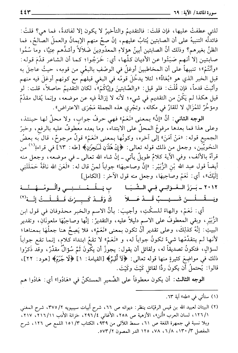 الوجه الثاني: أنَّ «إنَّ» بمعنى «نَعَمْ» فهي حرفُ جوابٍ، ولا محلَّ لها حينئذ، وعلى هذا فما بعدها مرفوعُ المحلِّ على الابتداء، وما بعده معطوفٌ عليه بالرفعِ، وخبرُ الجميعِ قوله: «مَنْ آمَنَ» إلى آخره، وكونُها بمعنى «نَعَمْ» قولٌ مرجوحٌ، قال به بعضُ النحْويِّين، وجعل من ذلك قوله تعالى: {إِنْ هذان لَسَاحِرَانِ} [طه: 63] في قراءةِ من قرأهُ بالألف، وفي الآية كلامٌ طويلٌ يأتي - إنْ شاء الله تعالى - في موضعه، وجعل منه أيضاً قول عبد الله بْنِ الزُّبَيْر: «إنَّ وصاحبهَا» جواباً لمنْ قال له: «لَعَنَ الله ناقَةً حَمَلَتْنِي إلَيْكَ» ، أي: نَعَمْ وصاحِبهَا، وجعل منه قول الآخر: [الكامل]