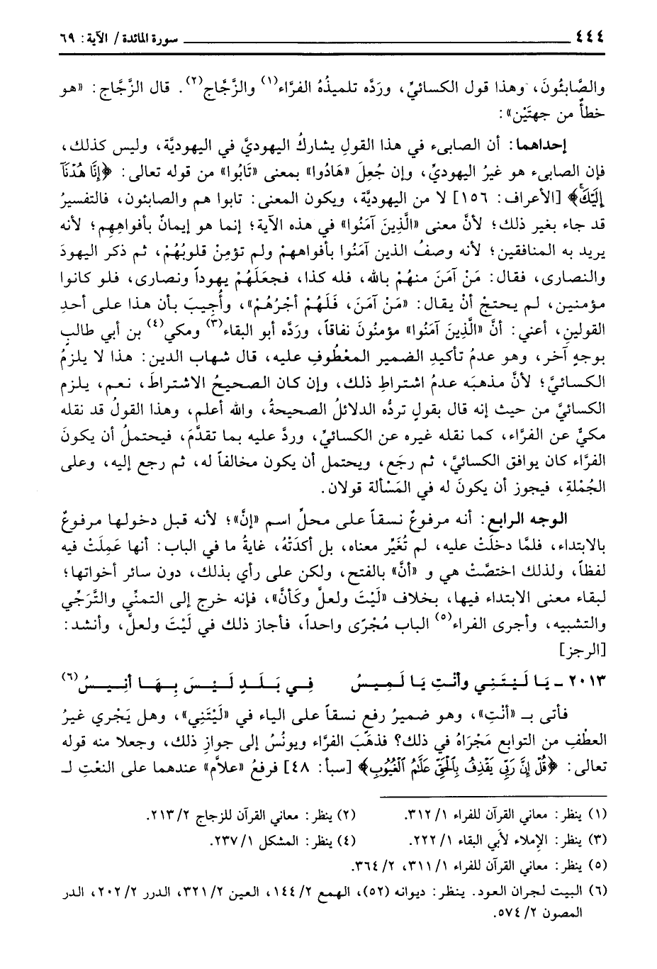 والصَّابئُونَ، وهذا قول الكسائيِّ، ورَدَّه تلميذُهُ الفرَّاء والزَّجَّاج. قال الزَّجَّاج: «هو خطأٌ من جهتَيْن» :