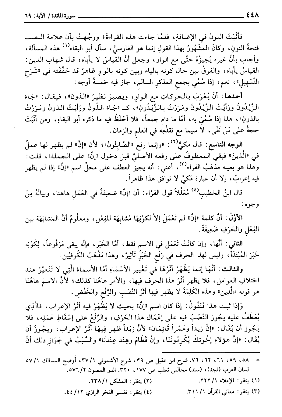 الوجه التاسع: قال مكيٌّ: «وإنما رفع» الصَّابِئُونَ «؛ لأن» إنَّ «لم يظهر لها عملٌ في» الَّذينَ «فبقي المعطوفُ على رفعه الأصليِّ قبل دخول» إنَّ «على الجملة» ، قلت: وهذا هو بعينه مذهَبُ الفراء، أعني: أنه يجيز العطف على محلِّ اسم «إنَّ» إذا لم يظهر فيه إعرابٌ، إلا أن عبارة مَكيٍّ لا توافق هذا ظاهراً.