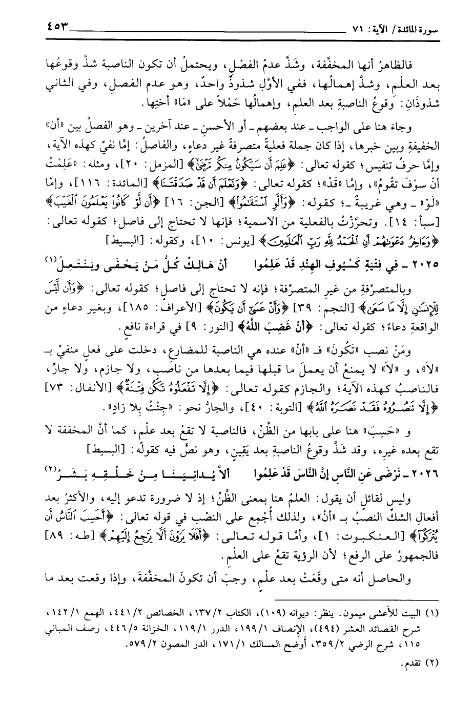 وجاءَ هنا على الواجب - عند بعضهم - أو الأحسنِ - عند آخرين - وهو الفصلُ بين «أن» الخفيفةِ وبين خبرها، إذا كان جملة فعليةً متصرفةً غير دعاءٍ، والفاصلُ: إمَّا نفي كهذه الآية، وإمَّا حرفُ تنفيس؛ كقوله تعالى: