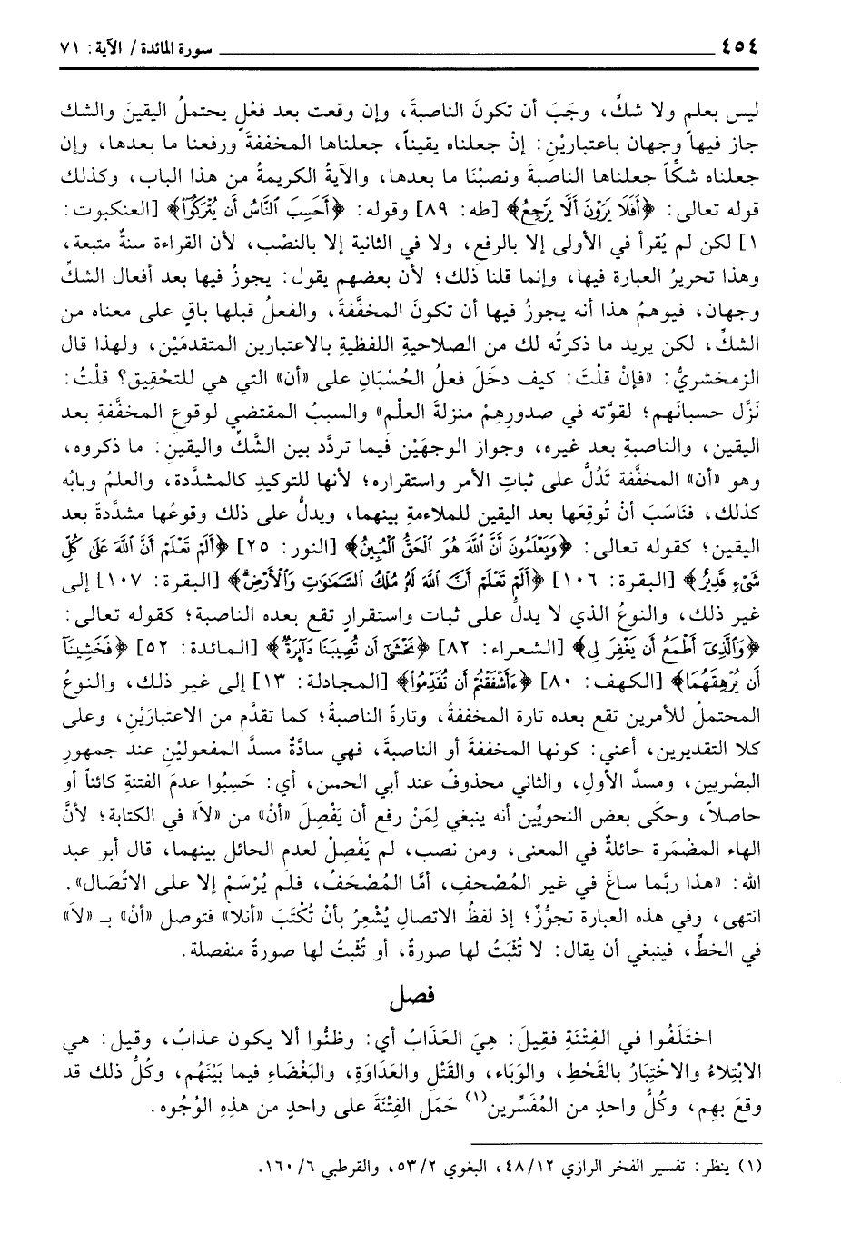 {وَيَعْلَمُونَ أَنَّ الله هُوَ الحق المبين} [النور: 25] {أَلَمْ تَعْلَمْ أَنَّ الله على كُلِّ شَيْءٍ قَدِيرٌ} [البقرة: 106] {أَلَمْ تَعْلَمْ أَنَّ الله لَهُ مُلْكُ السماوات والأرض} [البقرة: 107] إلى غير ذلك، والنوعُ الذي لا يدلُّ على ثبات واستقرارٍ تقع بعده الناصبة؛ كقوله تعالى: {والذي أَطْمَعُ أَن يَغْفِرَ لِي} [الشعراء: 82] {نخشى أَن تُصِيبَنَا دَآئِرَةٌ} [المائدة: 52] {فَخَشِينَآ أَن يُرْهِقَهُمَا} [الكهف: 80] {أَأَشْفَقْتُمْ أَن تُقَدِّمُواْ} [المجادلة: 13] إلى غير ذلك، والنوعُ المحتملُ للأمرين تقع بعده تارة المخففةُ، وتارةً الناصبةُ؛ كما تقدَّم من الاعتبارَيْنِ، وعلى كلا التقديرين، أعني: كونها المخففةَ أو الناصبةَ، فهي سادَّةٌ مسدَّ المفعوليْنِ عند جمهورِ البصْريين، ومسدَّ الأولِ، والثاني محذوفٌ عند أبي الحسن، أي: حَسِبُوا عدمَ الفتنةِ كائناً أو حاصلاً، وحكَى بعض النحويِّين أنه ينبغي لِمَنْ رفع أن يَفْصِلَ «أنْ» من «لاَ» في الكتابة؛ لأنَّ الهاء المضْمَرة حائلةٌ في المعنى، ومن نصب، لم يَفْصِلْ لعدمِ الحائل بينهما، قال أبو عبد الله: «هذا ربَّما ساغَ في غير المُصْحفِ، أمَّا المُصْحَفُ، فلَم يُرْسَمْ إلا على الاتِّصَال» . انتهى، وفي هذه العبارة تجوُّزٌ؛ إذ لفظُ الاتصالِ يُشْعِرُ بأنْ تُكْتَبَ «أنلا» فتوصل «أنْ» ب «لاَ» في الخطِّ، فينبغي أن يقال: لا تُثْبَتُ لها صورةٌ، أو تُثْبتُ لها صورةٌ منفصلة.