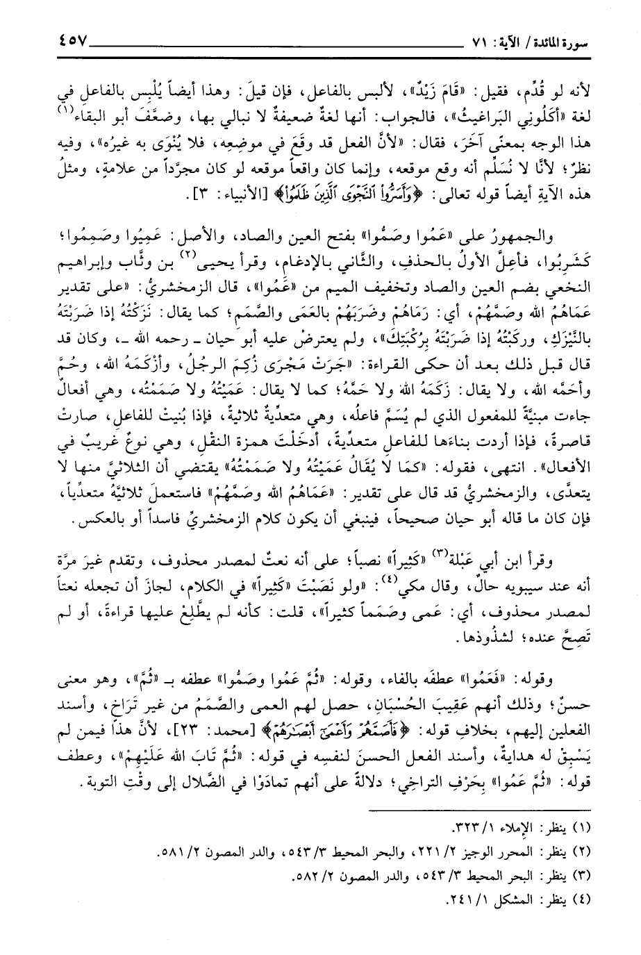 والجمهورُ على «عَمُوا وصَمُّوا» بفتح العين والصاد، والأصل: عَمِيُوا وصَمِمُوا؛ كَشَرِبُوا، فأعِلَّ الأولُ بالحذفِ، والثَّاني بالإدغامِ، وقرأ يحيى بن وثَّاب وإبراهيم النخعي بضم العين والصاد وتخفيف الميم من «عَمُوا» ، قال الزمخشريُّ: «على تقدير عَمَاهُمُ الله وصَمَّهُمْ، أي: رَمَاهُمْ وضَرَبَهُمْ بالعَمَى والصَّمَمِ؛ كما يقال: نَزَكْتُهُ إذا ضَرَبْتَهُ بالنَّيْزَكِ، وركَبْتُهُ إذا ضَرَبْتَهُ بِرُكْبَتِكَ» ، ولم يعترضْ عليه أبو حيان - رَحِمَهُ اللَّهُ -، وكان قد قال قبل ذلك بعد أن حكى القراءة: «جَرَتْ مَجْرَى زُكِمَ الرجُلُ، وأزْكَمَهُ الله، وحُمَّ وأحَمَّه الله، ولا يقال: زَكَمَهُ الله ولا حَمَّهُ؛ كما لا يقال: عَمَيْتُهُ ولا صَمَمْتُه، وهي أفعالٌ جاءت مبنيَّةً للمفعول الذي لم يُسَمَّ فاعلُه، وهي متعدِّيةٌ ثلاثيةٌ، فإذا بُنيتْ للفاعلِ، صارتْ قاصرةً، فإذا أردت بناءَها للفاعلِ متعدِّيةً، أدخَلْتَ همزة النقْلِ، وهي نوعٌ غريبٌ في الأفعال» . انتهى، فقوله: «كمَا لا يُقَالُ عَمَيْتُهُ ولا صَمَمْتُهُ» يقتضي أن الثلاثيَّ منها لا يتعدَّى، والزمخشريُّ قد قال على تقدير: «عَمَاهُمُ الله وصَمَّهُمْ» فاستعملَ ثلاثيَّةُ متعدِّياً، فإن كان ما قاله أبو حيان صحيحاً، فينبغي أن يكون كلام الزمخشريِّ فاسداً أو بالعكس.