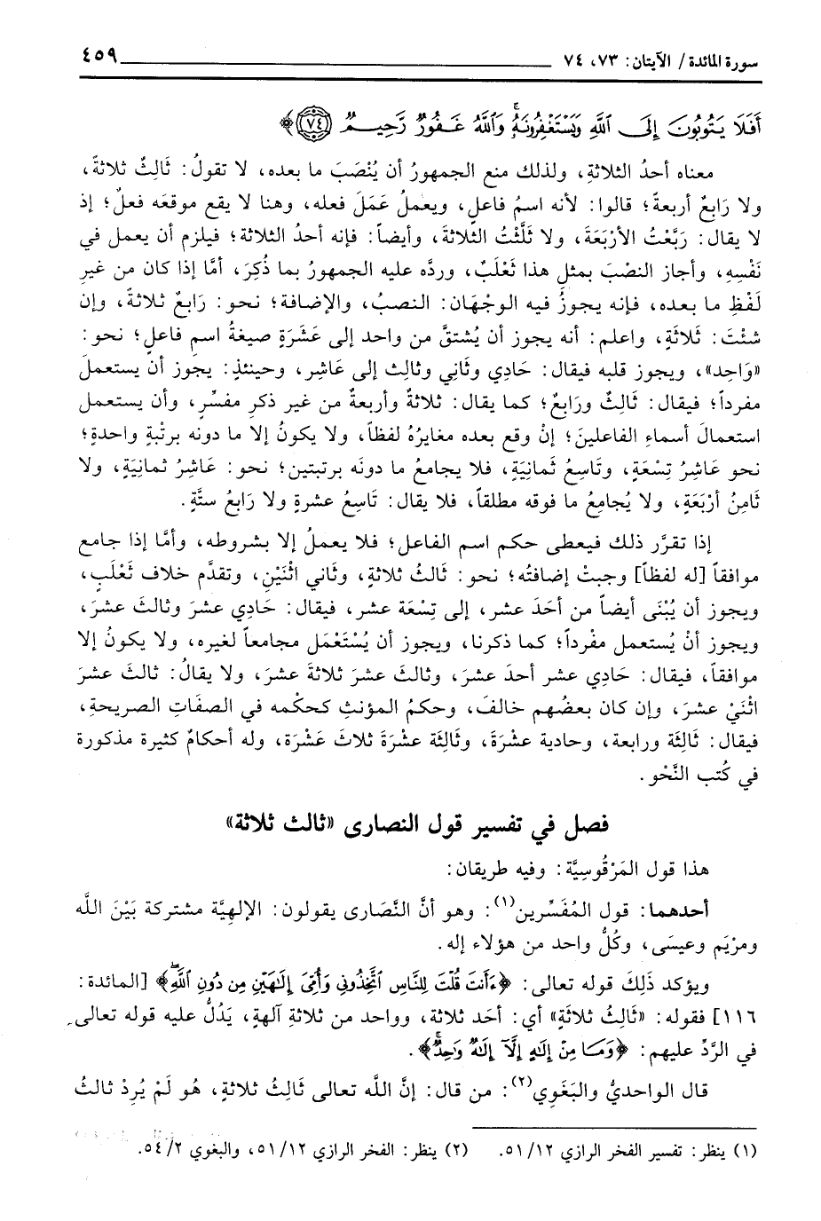 ويؤكد ذَلِكَ قوله تعالى: {أَأَنتَ قُلتَ لِلنَّاسِ اتخذوني وَأُمِّيَ إلهين مِن دُونِ الله} [المائدة: 116] فقوله: «ثَالِثُ ثلاثَةٍ» أي: أحَد ثلاثة، وواحد من ثلاثةِ آلهةٍ، يَدُلُّ عليه قوله تعالى في الرَّدِّ عليهم: {وَمَا مِنْ إله إِلاَّ إله وَاحِدٌ} . قال الواحديُّ والبَغَوِي: من قال: إنَّ اللَّه تعالى ثَالِثُ ثلاثةٍ، هُو لَمْ يُرِدْ ثالثُ