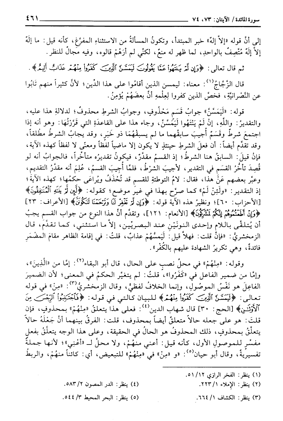 قوله: «لَيَمَسَّنَّ» جوابُ قَسَم مَحْذُوفٍ، وجوابُ الشرطِ محذوفٌ؛ لدلالةِ هذا عليه، والتقديرُ: واللَّهِ، إنْ لَمْ يَنْتَهُوا لَيَمَسَّنَّ، وجاء هذا على القاعدَةِ التي قَرَّرْتُهَا: وهو أنه إذا اجتمعَ شرطٌ وقَسَمٌ أُجيبَ سابقُهما ما لم يسبقْهُمَا ذو خَبَرٍ، وقد يجابُ الشرطُ مطْلقاً، وقد تقدَّم أيضاً: أن فعلَ الشرطِ حينئذٍ لا يكون إلا ماضياً لفظاً ومعنًى لا لفظاً كهذه الآية، فإنْ قيلَ: السابقُ هنا الشرطُ؛ إذ القسمُ مقدَّرٌ، فيكونُ تقديرُه متأخِّراً، فالجوابُ أنه لو قُصِدَ تأخُّرُ القسَمِ في التقدير، لأجيبَ الشرْطُ، فلمَّا أُجِيبَ القسمُ، عُلِمَ أنه مقدَّرُ التقديمِ، وعبَّر بعضهم عَنْ هذا، فقال: لامُ التوطئةِ للقسمِ قد تُحْذَفُ ويُراعَى حكمُها؛ كهذه الآيةَ؛ إذ التقدير: «ولَئِنْ لَمْ» كما صرَّح بهذا في غير موضع؛ كقوله: {لَّئِن لَّمْ يَنتَهِ المنافقون} [الأحزاب: 60] ؛ ونظيرُ هذه الآية قوله: {وَإِن لَّمْ تَغْفِرْ لَنَا وَتَرْحَمْنَا لَنَكُونَنَّ} [الأعراف: 23] {وَإِنْ أَطَعْتُمُوهُمْ إِنَّكُمْ لَمُشْرِكُونَ} [الأنعام: 121] ، وتقدَّم أنَّ هذا النوع من جواب القسمِ يجبُ أن يُتلقَّى باللام وإحدى النونَيْنِ عند البصريِّين، إلاَّ ما استثني، كما تقدَّمَ، قال الزمخشريُّ: «فإنْ قلت: فهلاَّ قيل: لَيَمسُّهُمْ عذابٌ، قلتُ: في إقامة الظاهر مقامَ المضْمَرِ فائدةٌ، وهي تكريرُ الشهادة عليهم بالكُفْر» .