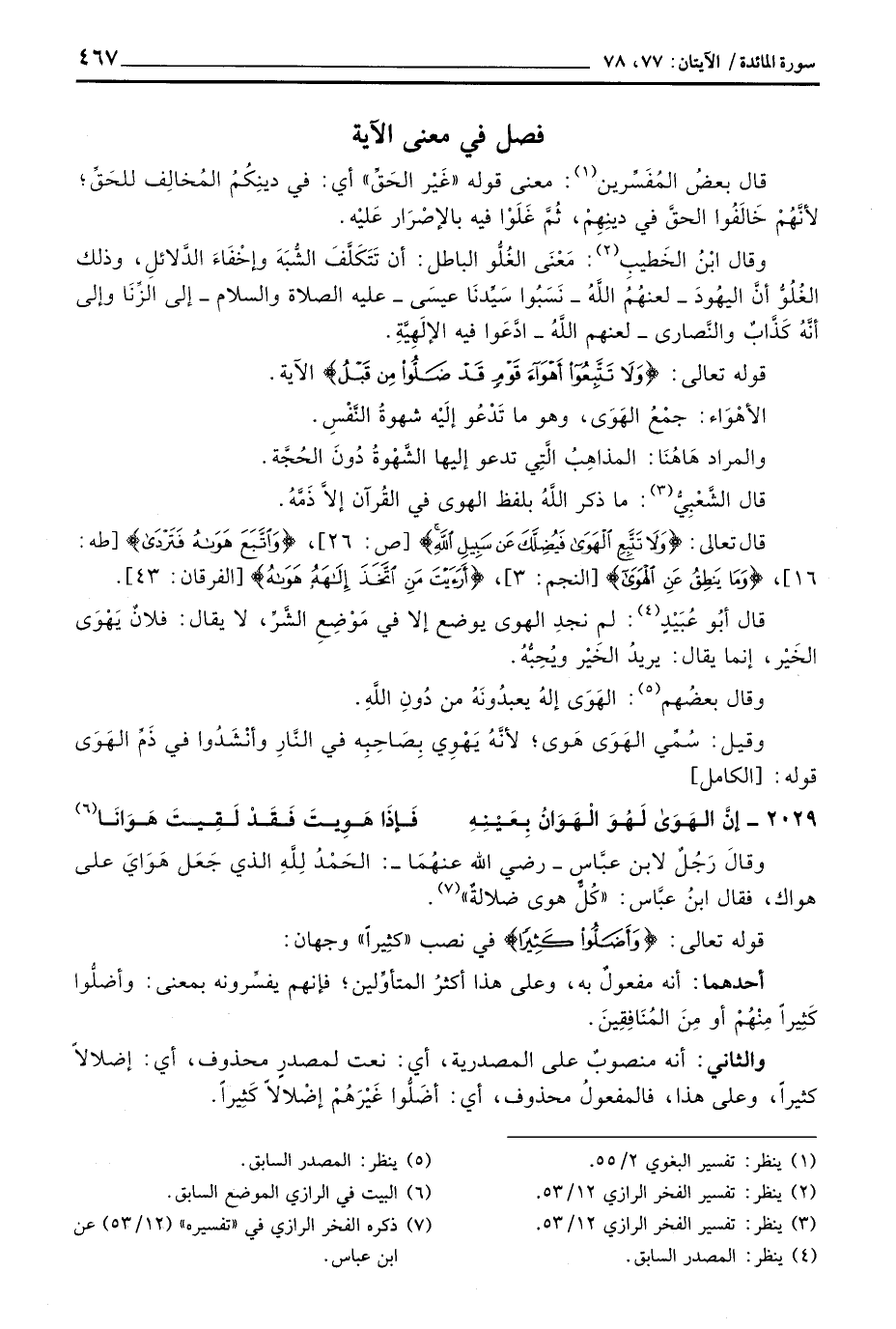وقال ابْنُ الخَطيبِ: مَعْنَى الغُلُّو الباطل: أن تَتَكَلَّفَ الشُّبَهَ وإخْفَاءَ الدَّلائلِ، وذلك الغُلُوُّ أنَّ اليهُودَ - لعنُهُم اللَّهُ - نَسَبُوا سَيِّدنَا عيسَى - عَلَيْهِ الصَّلَاة وَالسَّلَام ُ - إلى الزِّنَا وإلى أنَّهُ كَذَّابٌ والنَّصارى - لعنهم اللَّهُ - ادَّعَوا فيه الإلَهِيَّةِ.