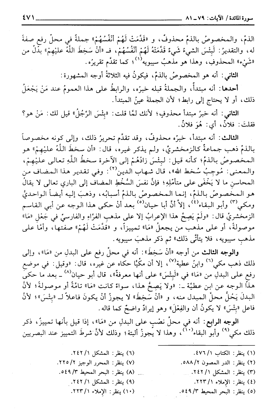 الثالث: أنه مبتدأ، خبرُه محذوفٌ، وقد تقدَّم تحريرُ ذلك، وإلى كونه مخصوصاً بالذمِّ ذهب جماعةٌ كالزمخشريِّ، ولم يذكر غيره، قال: {أَن سَخِطَ الله عَلَيْهِمْ} هو المخصوصُ بالذمِّ؛ كأنه قيل: لبِئْسَ زادُهُمْ إلى الآخرة سخطُ اللَّهِ تعالى عليْهِمْ، والمعنى: مُوجِبُ سُخط الله «، قال شهاب الدين: وفي تقدير هذا المضاف من المحاسنِ ما لا يَخْفَى على متأمِّلِهِ؛ فإنَّ نفسَ السُّخْطِ المضاف إلى الباري تعالى لا يقالُ هو المخصوصُ بالذمِّ، إنما المخصوصُ بالذمِّ أسبابُه، وذهبَ إليه أيضاَ الواحديُّ ومكي وأبو البقاء، إلاَّ أنَّ أبا حيان بعد أنْ حكى هذا الوجه عن أبي القاسم الزمخشريِّ قال:» ولَمْ يَصِحَّ هذا الإعرابُ إلا على مذهبِ الفرَّاءِ والفارسيِّ في جَعْلِ «مَا» موصولةً، أو على مذهب من يجعلُ «مَا» تمييزاً، و «قَدَّمَتْ لَهُمْ» صفتها، وأمَّا على مذهبِ سيبويه، فلا يتأتَّى ذلك «ثم ذكر مذهبَ سيبويه.