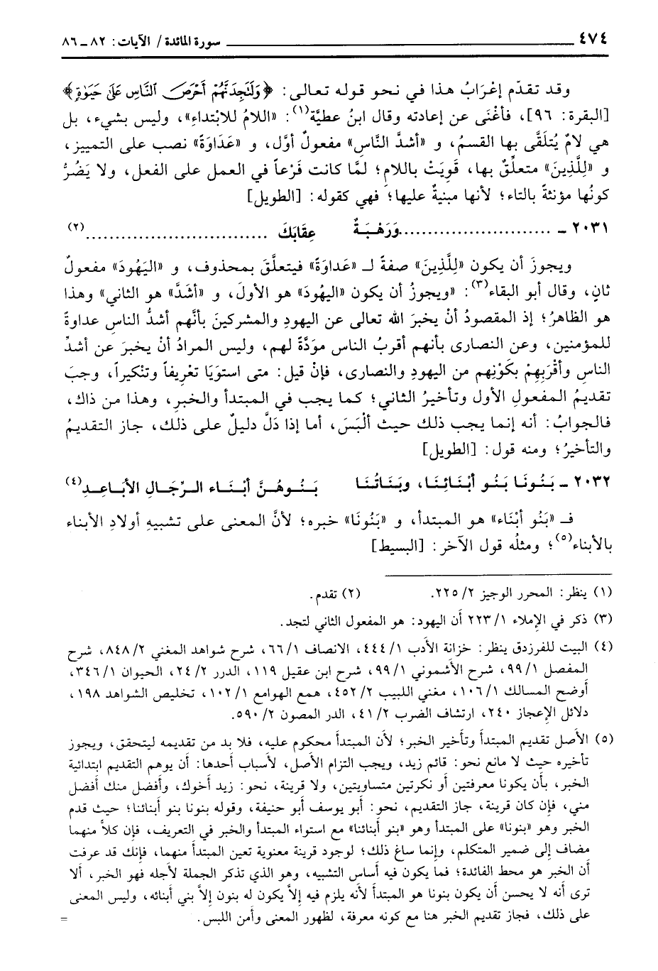 ويجوزَ أن يكون «لِلَّذِينَ» صفةً ل «عَدَاوَةً» فيتعلَّقَ بمحذوف، و «اليَهُودَ» مفعولٌ ثانٍ، وقال أبو البقاء: «ويجوزُ أن يكون» اليهُودَ «هو الأولَ، و» أشَدَّ «هو الثاني» وهذا هو الظاهرُ؛ إذ المقصودُ أنْ يخبرَ الله تعالى عن اليهودِ والمشركينَ بأنَّهم أشدُّ الناسِ عداوةً للمؤمنين، وعن النصارى بأنهم أقربُ الناس موَدَّةً لهم، وليس المرادُ أنْ يخبرَ عن أشدِّ الناسِ وأقْرَبِهِمْ بكَوْنِهِم من اليهودِ والنصارى، فإنْ قيل: متى استوَيَا تعْرِيفاً وتنْكيراً، وجبَ تقديمُ المفعولِ الأول وتأخيرُ الثاني؛ كما يجب في المبتدأ والخبرِ، وهذا من ذاك، فالجوابُ: أنه إنما يجب ذلك حيث ألْبَسَ، أما إذا دَلَّ دليلٌ على ذلك، جاز التقديمُ والتأخيرُ؛ ومنه قول: [الطويل]