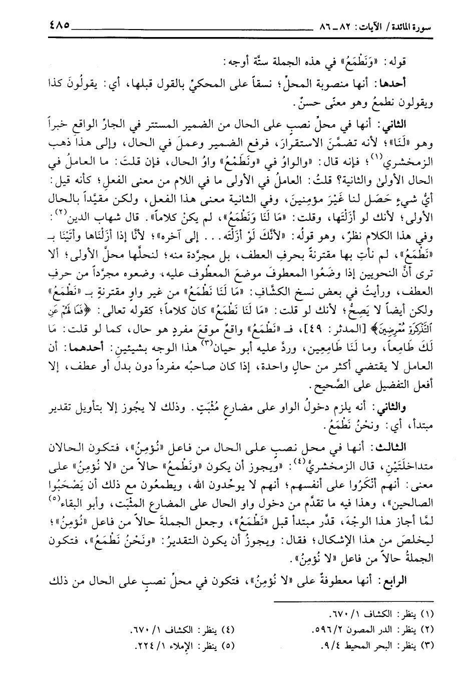 {فَمَا لَهُمْ عَنِ التذكرة مُعْرِضِينَ} [المدثر: 49] ، ف «نَطْمَعُ» واقعٌ موقعَ مفردٍ هو حال، كما لو قلت: مَا لَكَ طَامِعاً، وما لَنَا طَامِعِين، وردَّ عليه أبو حيان هذا الوجه بشيئينِ: أحدهما: أن العامل لا يقتضي أكثر من حالٍ واحدة، إذا كان صاحبُه مفرداً دون بدل أو عطف، إلا أفعل التفضيل على الصَّحيح.