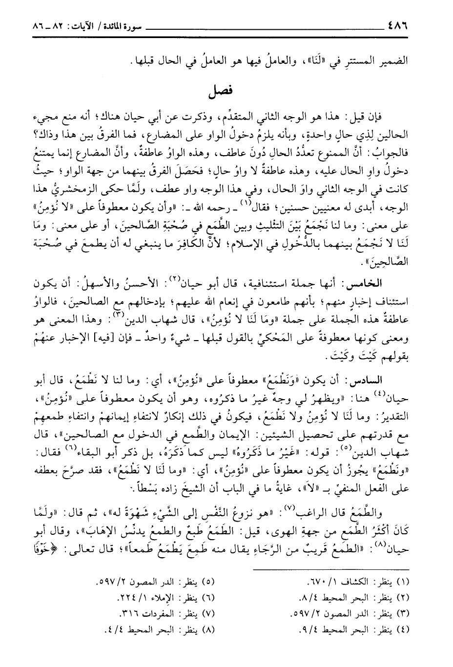 السادس: أن يكون «وَنَطْمَعُ» معطوفاً على «نُؤمِنُ» ، أي: وما لنا لا نَطْمَعُ، قال أبو حيان هنا: «ويظهر لي وجهٌ غيرُ ما ذكرُوه، وهو أن يكون معطوفاً على» نُؤمِنُ «، التقديرُ: وما لَنَا لا نُؤمِنُ ولا نَطْمَعُ، فيكونُ في ذلك إنكارٌ لانتفاءِ إيمانهمْ وانتفاءِ طمعهِمْ مع قدرتهم على تحصيل الشيئين: الإيمان والطَّمع في الدخول مع الصالحين» ، قال شهاب الدين: قوله: «غَيْرُ ما ذَكَرُوهُ» ليس كما ذَكَرَهُ، بل ذكر أبو البقاء فقال: «ونَطْمَعُ» يجُوزُ أن يكون معطوفاً على «نُؤمِنُ» ، أي: «وما لَنَا لا نَطْمَعُ» ، فقد صرَّحَ بعطفه على الفعل المنفيِّ ب «لاَ» ، غايةُ ما في الباب أن الشيخَ زاده بَسْطاً.