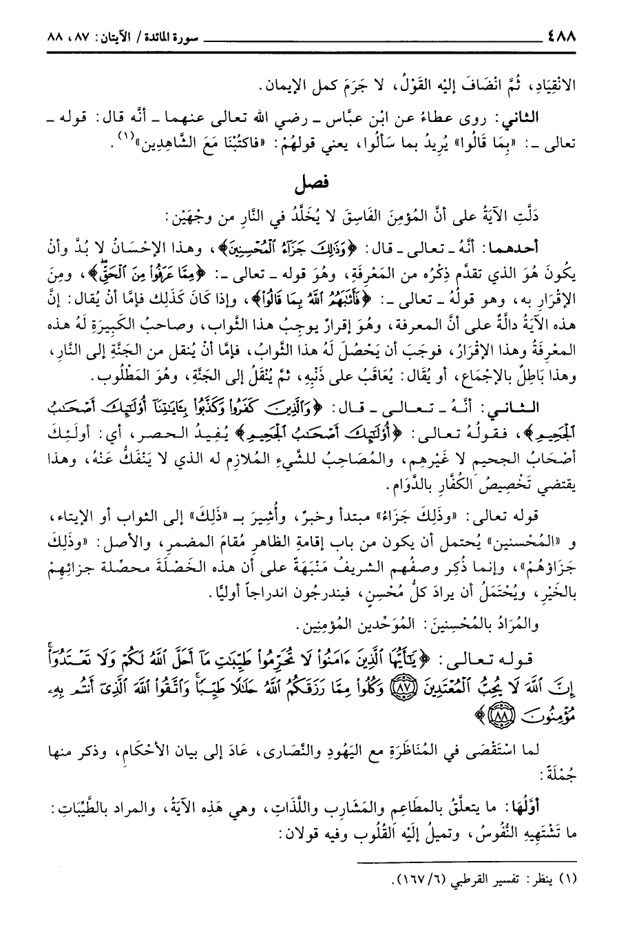 أحدهما: أنَّهُ - تعالى - قال: {وذلك جَزَآءُ المحسنين} ، وهذا الإحْسَانُ لا بُدَّ وأنْ يكُونَ هُوَ الذي تقدَّم ذِكْرُه من المَعْرِفَةِ، وهُوَ قوله - تعالى -: {مِمَّا عَرَفُواْ مِنَ الحق} ، ومِنَ الإقْرَارِ به، وهو قولُهُ - تعالى -: {فَأَثَابَهُمُ الله بِمَا قَالُواْ} ، وإذا كَانَ كَذَلِك فإمَّا أنْ يُقال: إنَّ هذه الآيَةُ دالَّةٌ على أنَّ المعرفة، وهُوَ إقرارٌ يوجِبُ هذا الثَّواب، فإمَّا أنْ يُنقل من الجَنَّةِ إلى النَّارِ، وهذا بَاطِلٌ بالإجْمَاع، أو يُقَال: يُعاقَبُ على ذَنْبِهِ، ثمَّ يُنْقَلُ إلى الجَنَّةِ، وهُوَ المَطْلُوب.