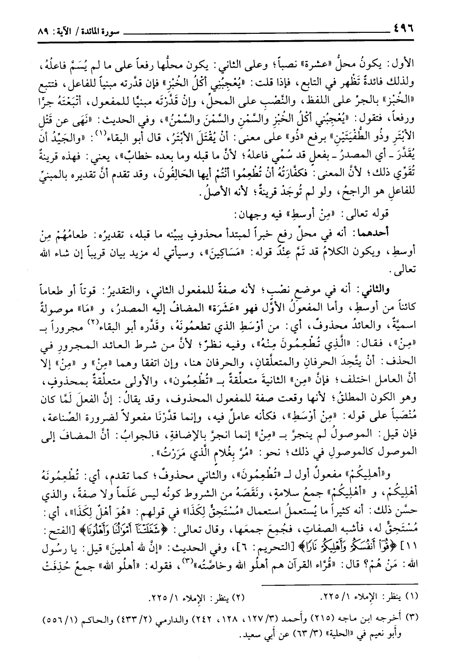 الأول: يكونُ محلُّ «عشرة» نصباً؛ وعلى الثاني: يكون محلُّها رفعاً على ما لم يُسَمَّ فاعلُهُ، ولذلك فائدةٌ تَظْهر في التابع، فإذا قلت: «يُعْجِبُنِي أكْلُ الخُبْزِ» فإن قدَّرته مبنياً للفاعل، فتتبع «الخُبْز» بالجرِّ على اللفظ، والنَّصْبِ على المحلِّ، وإنْ قَدَّرْتَه مبنيًّا للمفعول، أتْبَعْتَهُ جرًّا ورفعاً، فتقول: «يُعْجِبُني أكْلُ الخُبْزِ والسَّمْنِ والسَّمْنَ والسَّمْنُ» ، وفي الحديث: «نَهَى عن قَتْلِ الأبْتَرِ وذُو الطُّفَيَتَيْنِ» برفع «ذُو» على معنى: أنْ يُقْتَلَ الأبْتَرُ، قال أبو البقاء: «والجَيِّدُ أن يُقَدَّرَ - أي المصدرُ - بفعلٍ قد سُمِّي فاعلُه؛ لأنَّ ما قبله وما بعده خطاب» ، يعني: فهذه قرينةٌ تُقَوِّي ذلك؛ لأنَّ المعنى: فكفَّارَتُهُ أنْ تُطْعِمُوا أنْتُمْ أيها الحَالِفُونَ، وقد تقدم أنَّ تقديره بالمبنيِّ للفاعلِ هو الراجحُ، ولو لم تُوجَدُ قرينةٌ؛ لأنه الأصلُ.