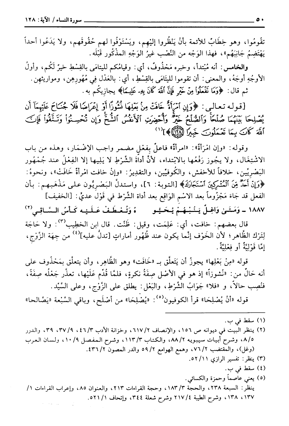 وقوله: «وَإِنِ امرأة» : «امرأةٌ» فاعلٌ بِفعْلٍ مضمر واجب الإضْمَار، وهذه من باب الاشْتِغَال، ولا يجُوز رَفْعُها بالابْتداء، لأنَّ أداةَ الشَّرْطِ لا يَلِيها إلا الفِعْلُ عند جُمْهُور البَصْرِيِّين، خلافاً للأخفش، والكُوفيِّين، والتقديرُ: «وإنْ خافت امْرأةٌ خَافَتْ» ، ونحوهُ: {وَإِنْ أَحَدٌ مِّنَ المشركين استجارك} [التوبة: 6] ، واستدلَّ البَصْرِيُّون على مَذْهَبهم: بأن الفعل قد جَاءَ مَجْزُوماً بعد الاسْمِ الوَاقِع بعد أداة الشَّرْط في قَوْل عديٍّ: [الخفيف]