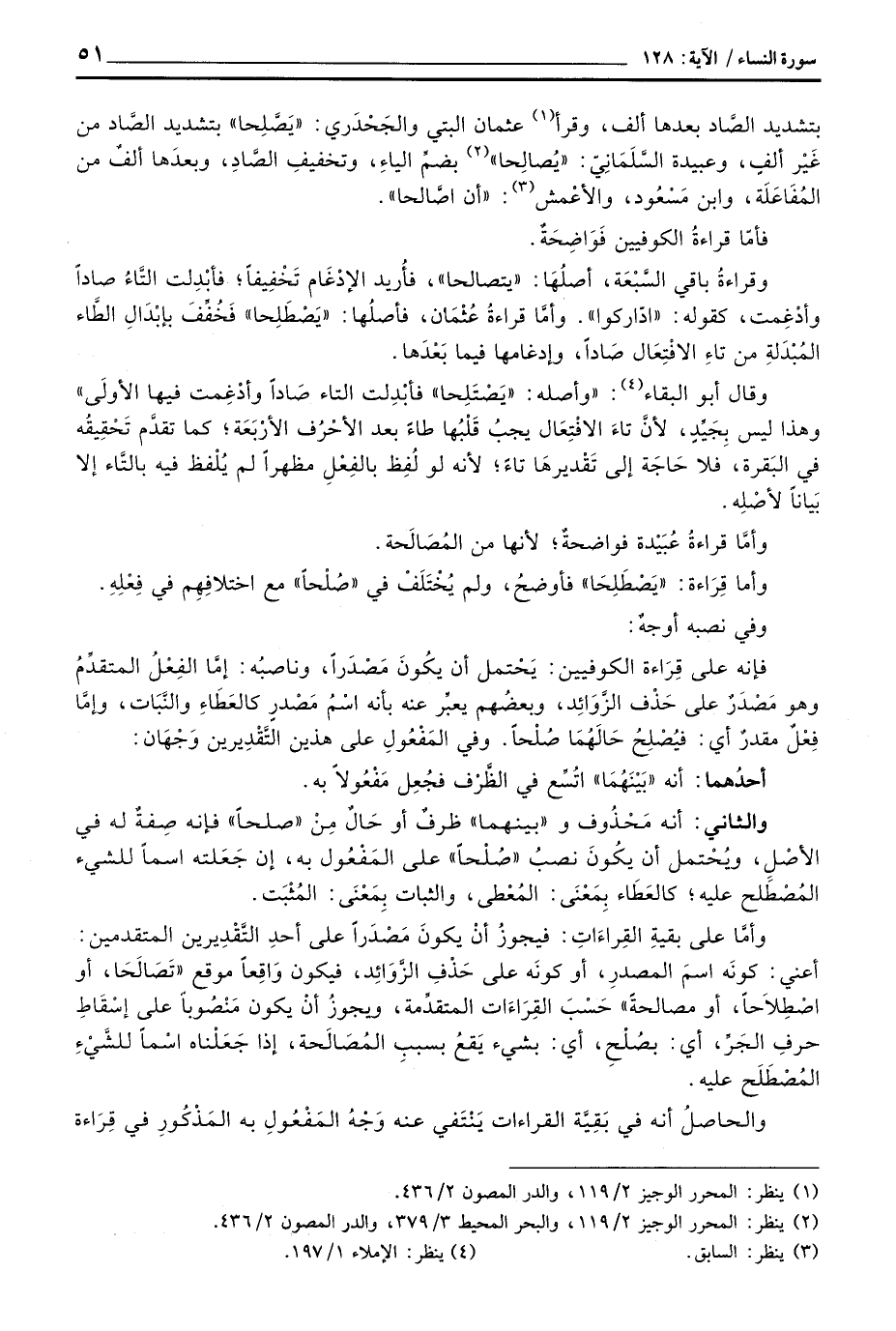 وقراءةُ باقي السَّبْعَة، أصلُهَا: «يتصالحا» ، فأُريد الإدْغَام تَخْفِيفاً؛ فأبْدِلت التَّاءُ صاداً وأدْغِمت، كقوله: «ادّاركوا» . وأمَّا قراءةُ عُثْمَان، فأصلُها: «يَصْطَلِحا» فَخُفِّفَ بإبْدَالِ الطَّاء المُبْدَلةِ من تاءِ الافْتِعَال صَاداً، وإدغامها فيما بَعْدَها.