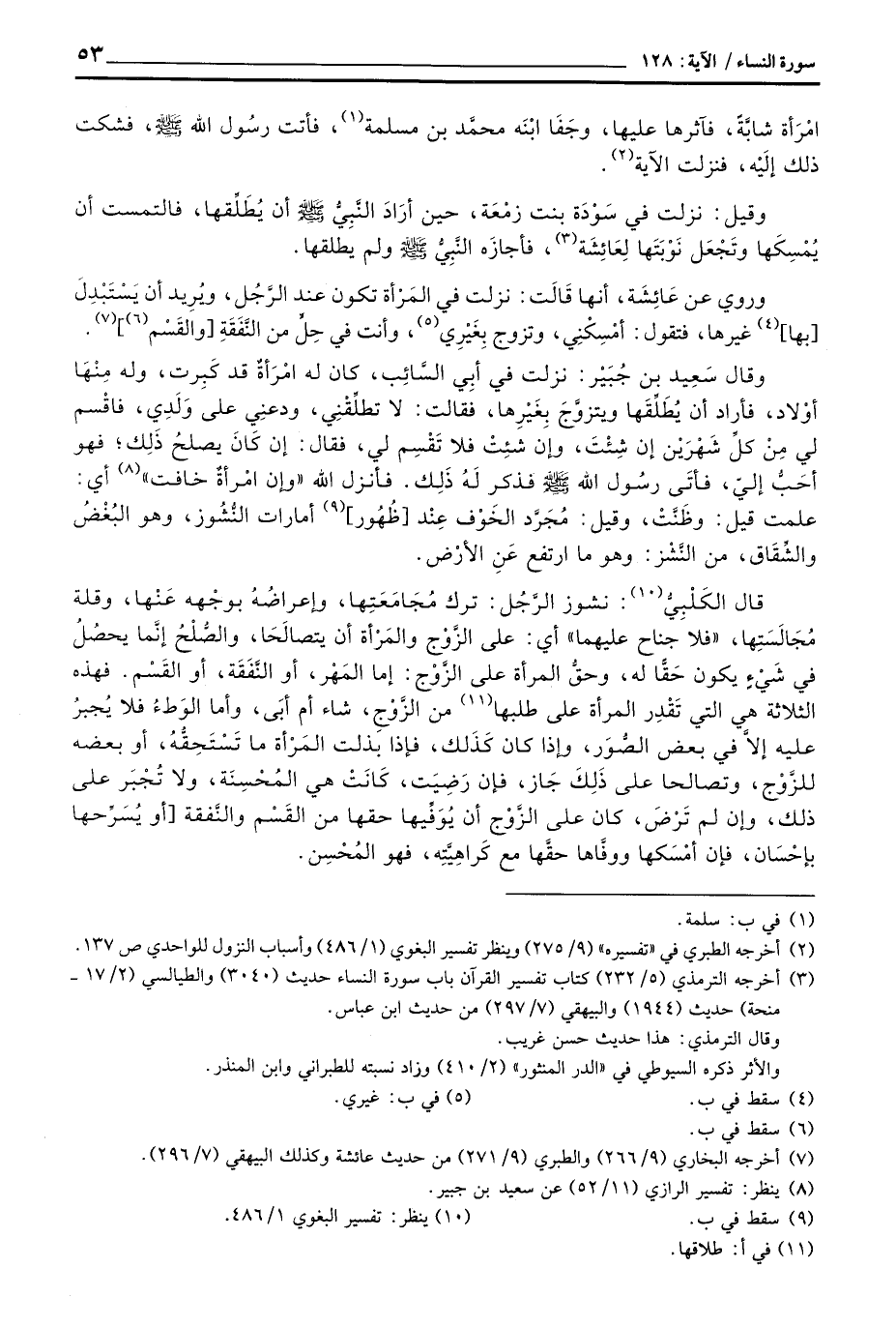 وقيل: نزلت في سَوْدَة بنت زمْعَة، حين أرَادَ النَّبِيُّ صَلَّى اللَّهُ عَلَيْهِ وَسَلَّم َ أن يُطَلِّقها، فالتمست أن يُمْسِكَها وتَجْعَل نَوْبَتَها لِعَائِشَة، فأجازَه النَّبِيُّ صَلَّى اللَّهُ عَلَيْهِ وَسَلَّم َ ولم يطلقها.
