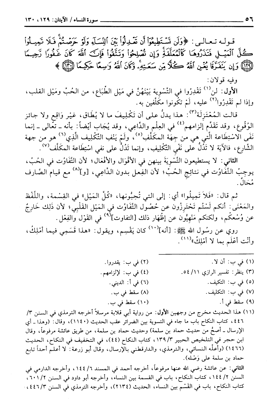 الأول: لن تَقْدِرُوا في التَّسْوِية بَيْنَهُنَّ في مَيْل الطِّبَاع، من الحُبِّ ومَيْل القلب، وإذا لم تَقْدِرُوا عليه، لَمْ تكُونوا مكَلَّفين به.