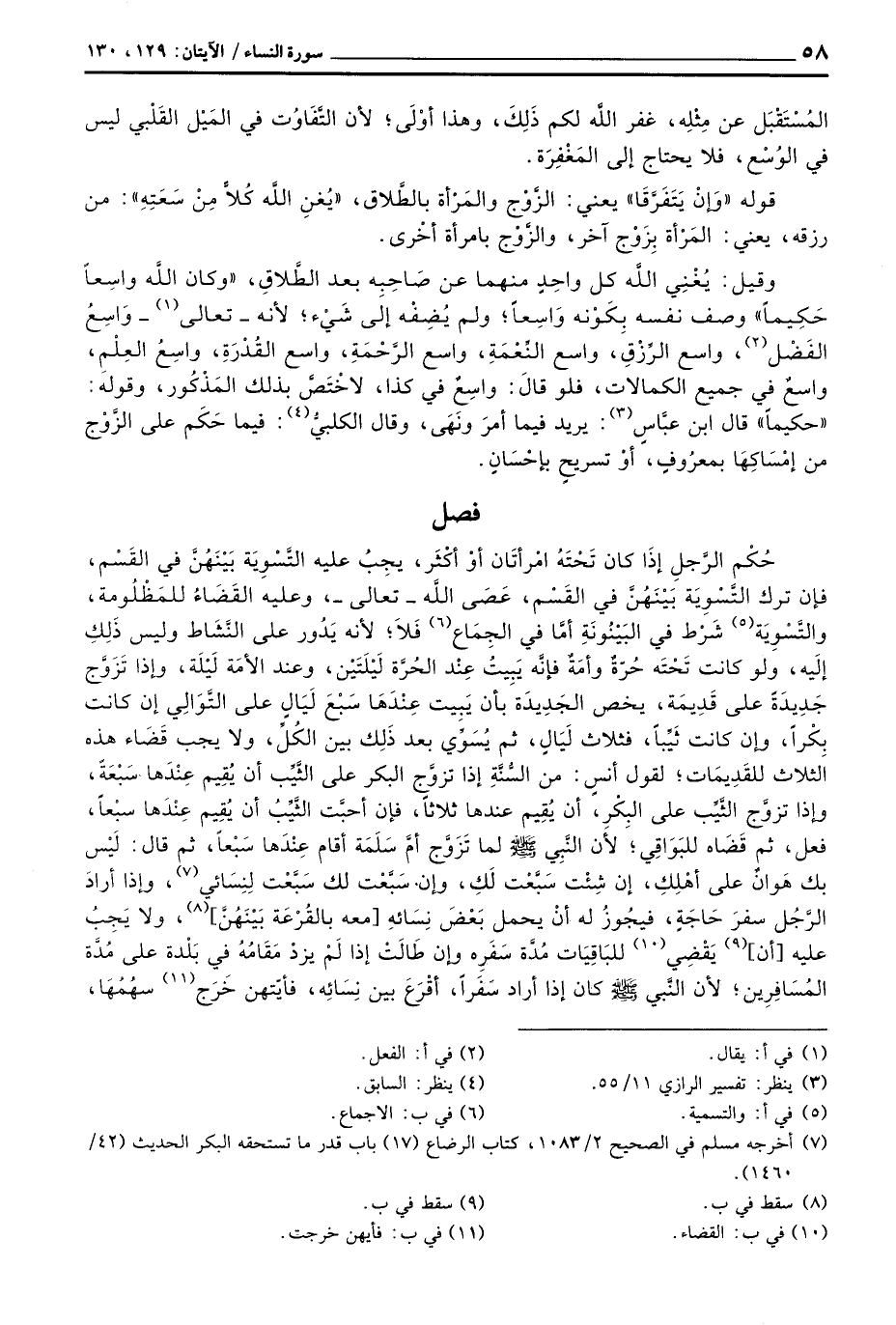 حُكْم الرَّجلِ إذا كان تَحْتَهُ امْرأتَان أوْ أكْثَر، يجِبُ عليه التَّسْوِيَة بَيْنَهُنَّ في القَسْم، فإن ترك التَّسْوِيَة بَيْنَهُنَّ في القَسْم، عَصَى اللَّه - تعالى -، وعليه القَضَاءُ للمَظْلُومة، والتَّسْوِيَة شَرْط في البَيْنُونَةِ أمَّا في الجِمَاع فَلاَ؛ لأنه يَدُور على النَّشَاطِ وليس ذَلِكِ إليه، ولو كانت تَحْتَه حُرّةٌ وأمَةٌ فإنَّه يَبِيتُ عِنْد الحُرَّة لَيْلَتَيْن، وعند الأمَة لَيْلَة، وإذا تَزَوَّج جَدِيدَةً على قَدِيمَة، يخص الجَدِيدَة بأن يَبِيت عِنْدَهَا سَبْعَ لَيَالٍ على التَّوالِي إن كانت بِكْراً، وإن كانت ثَيِّباً، فثلاث لَيَالٍ، ثم يُسَوِّي بعد ذَلِك بين الكُلِّ، ولا يجب قَضَاء هذه الثلاث للقَدِيمَات؛ لقول أنسٍ: من السُّنَّةِ إذا تزوَّج البكر على الثَّيِّب أن يُقِيم عِنْدَها سَبْعَةً، وإذا تزوَّج الثَّيِّب على البِكْرِ، أن يُقِيم عندها ثلاثاً، فإن أحبَّت الثَّيِّبُ أن يُقِيم عِنْدَها سبْعاً، فعل، ثم قَضَاه للبَوَاقِي؛ لأن «النَّبِي صَلَّى اللَّهُ عَلَيْهِ وَسَلَّم َ لما تَزَوَّج أمَّ سَلَمَة أقام عِنْدَها سَبْعاً، ثم قال: لَيْس بك هَوانٌ على أهْلِكِ، إن شِئْت سَبَّعْت لَكِ، وإن سَبَّعْت لك سَبَّعْت لِنِسَائي» ، وإذا أرادَ الرَّجُل سفرَ حَاجَةٍ، فيجُوزُ له أنْ يحمل بَعْضَ نِسَائِه [معه بالقُرْعَة بَيْنَهُنَّ] ، ولا يَجِبُ عليه [أن] يَقْضِي للبَاقِيَات مُدَّة سَفَرِه وإن طَالَتْ إذا لَمْ يزدْ مَقَامُهُ في بَلْدة على مُدَّة المُسَافِرِين؛ لأن النَّبي صَلَّى اللَّهُ عَلَيْهِ وَسَلَّم َ كان إذا أراد سَفَراً، أقْرَعَ بين نِسَائِه، فأيّتهن خَرَج سهُمُهَا،