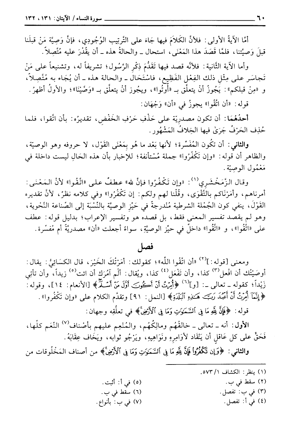 وقال الزَّمَخْشَرِي: {وَإِن تَكْفُرُواْ فَإِنَّ للَّهِ} عطفٌ على «اتَّقُوا» لأنَّ المَعْنَى: أمرناهم، وأمَرْنَاكم بالتَّقْوَى، وقُلْنا لهم ولكم: «إِن تَكْفُرُواْ» وفي كلامه نظرٌ، لأنَّ تقديره القَوْلَ، ينفي كون الجُمْلة الشرطية مُنْدرجةً في حَيِّزِ الوصيَّة بالنِّسْبَة إلى الصِّناعة النَّحْوية، وهو لم يقصد تفسير المعنى فقط، بل قصده هو وتفسير الإعراب؛ بدليل قوله: عطف على «اتَّقُوا» ، و «اتَّقُوا» داخلٌ في حيِّز الوصيَّةِ، سواءً أجعلت «أن» مصدريَّةً أم مُفسِّرة.