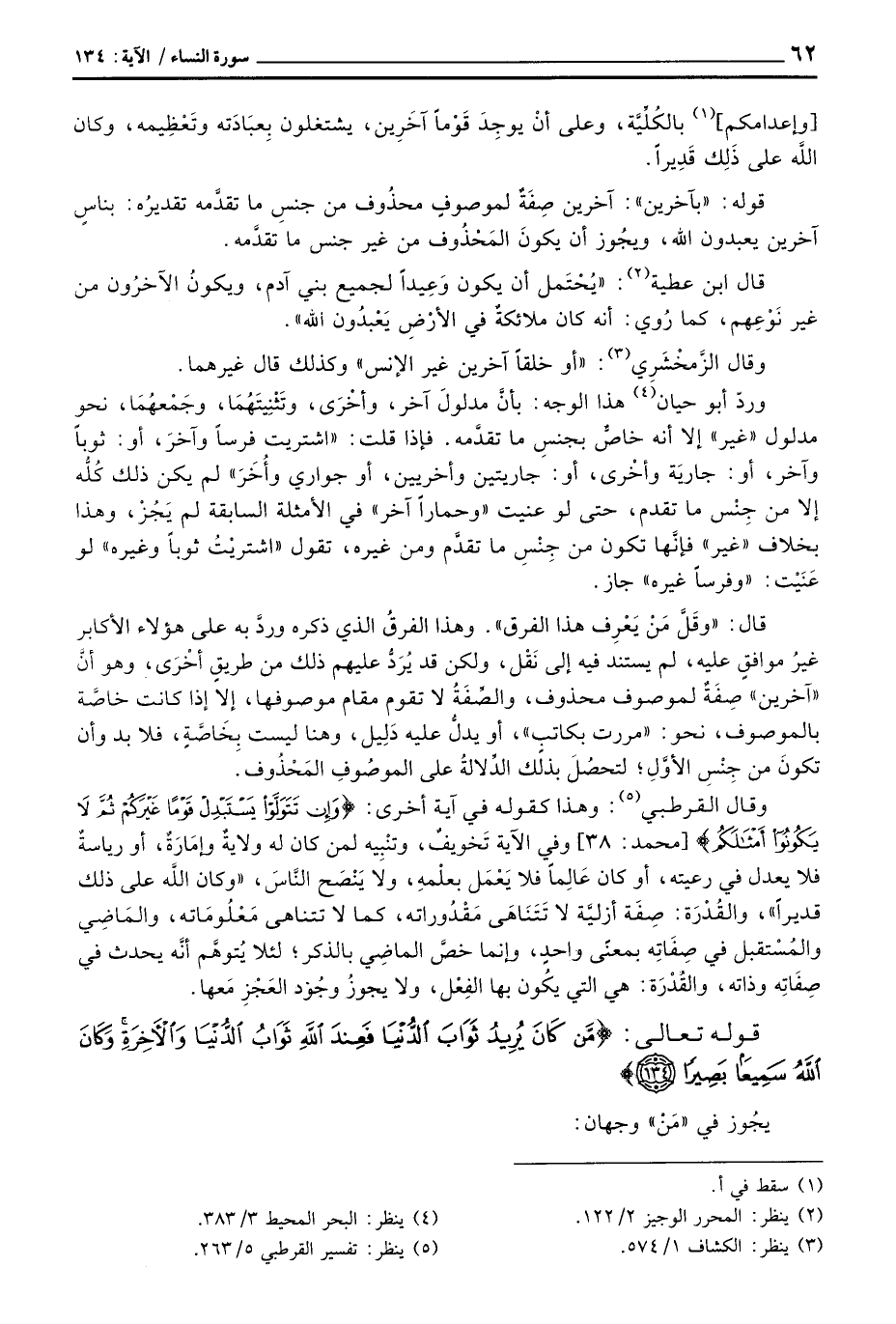 قال: «وقَلَّ مَنْ يَعْرِف هذا الفرق» . وهذا الفرقُ الذي ذكره وردَّ به على هؤلاء الأكابر غيرُ موافقٍ عليه، لم يستند فيه إلى نَقْل، ولكن قد يُرَدُّ عليهم ذلك من طريقٍ أخْرَى، وهو أنَّ «آخرين» صِفَةٌ لموصوف محذوف، والصِّفَةُ لا تقوم مقام موصوفها، إلا إذا كانت خاصَّة بالموصوف، نحو: «مررت بكاتبٍ» ، أو يدلُّ عليه دَلِيل، وهنا ليست بِخَاصَّةٍ، فلا بد وأن تكونَ من جِنْسِ الأوَّلِ؛ لتحصُلَ بذلك الدِّلالةُ على الموصُوفِ المَحْذُوف.