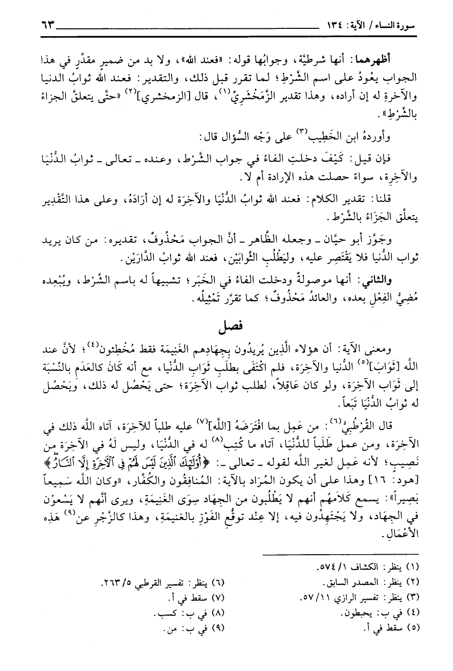 قال القُرْطُبِيُّ: من عَمِل بما افْتَرَضَهُ [اللَّه] عليه طلباً للآخِرَة، آتاه اللَّه ذلك في الآخِرَة، ومن عمل طَلَباً للدُّنْيَا، آتاه ما كُتِب له في الدُّنْيَا، وليس لَهُ في الآخِرَة من نَصِيبٍ؛ لأنه عَمِل لغير اللَّه لقوله - تعالى -: {أولئك الذين لَيْسَ لَهُمْ فِي الآخرة إِلاَّ النار} [هود: 16] وهذا على أن يكون المُرَاد بالآية: المُنافِقُون والكُفَّار، {وَكَانَ الله سَمِيعاً بَصِيراً} : يسمع كَلاَمَهُم أنهم لا يَطْلُبون من الجِهَاد سِوَى الغَنِيمَةِ، ويرى أنَّهم لا يَسْعوْن في الجِهَاد، ولا يَجْتَهِدُون فيه، إلا عِنْد توقُّعِ الفَوْزِ بالغنيمَةِ، وهذا كالزَّجْرِ عن هَذِه الأعْمَالِ.