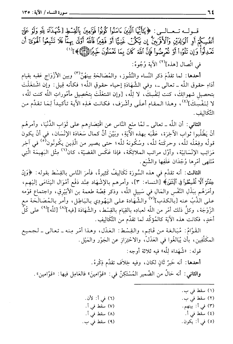 أحدها: لما تقدَّمَ ذكر النِّساء والنُّشُوز، والمُصَالحَةِ بينهُنَّ وبين الأزْوَاج عَقبه بقيام أدَاءِ حقوق اللَّه - تعالى -، وفي الشَّهَادَةِ إحياء حقوقِ اللَّه؛ فكأنه قِيل: وإن اشْتغَلْتَ بتحصيلِ شهواتِكَ، كنت لِنَفْسِكَ، لا لِلَّه، [وإن اشتغَلْتَ بِتحْصِيل مأمُوراتِ اللَّه كنت للَّه، لا لِنَفْسِكَ] ، وهذا المقام أعلَى وأشْرَف، فكانت هَذِه الآية تأكيداً لِمَا تقدَّم من التَّكَالِيفِ.