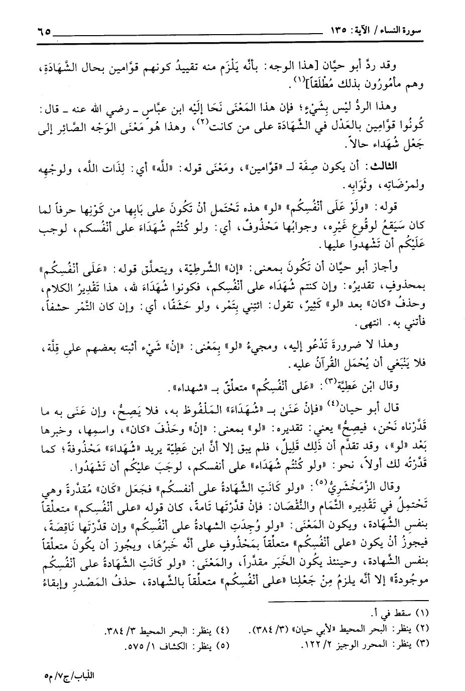 قال أبو حيان «فإنْ عَنَى ب» شُهَدَاءَ «المَلْفُوظ به، فلا يَصِحُّ، وإن عَنَى به ما قَدَّرْناه نَحْن، فيصِحُّ» يعني: تقديره: «لو» بمعنى: «إنْ» وحَذْفَ «كان» ، واسمِها، وخبرها بَعْد «لو» ، وقد تقدَّم أن ذَلِك قَلِيلٌ، فلم يبق إلا انَّ ابن عَطِيّة يريد «شُهَداءَ» مَحْذُوفةً؛ كما قَدَّرْتُه لك أولاً، نحو: «ولو كُنْتُم شُهَدَاء» على أنفسكم، لوجَبَ عليْكُم أن تَشْهَدُوا.