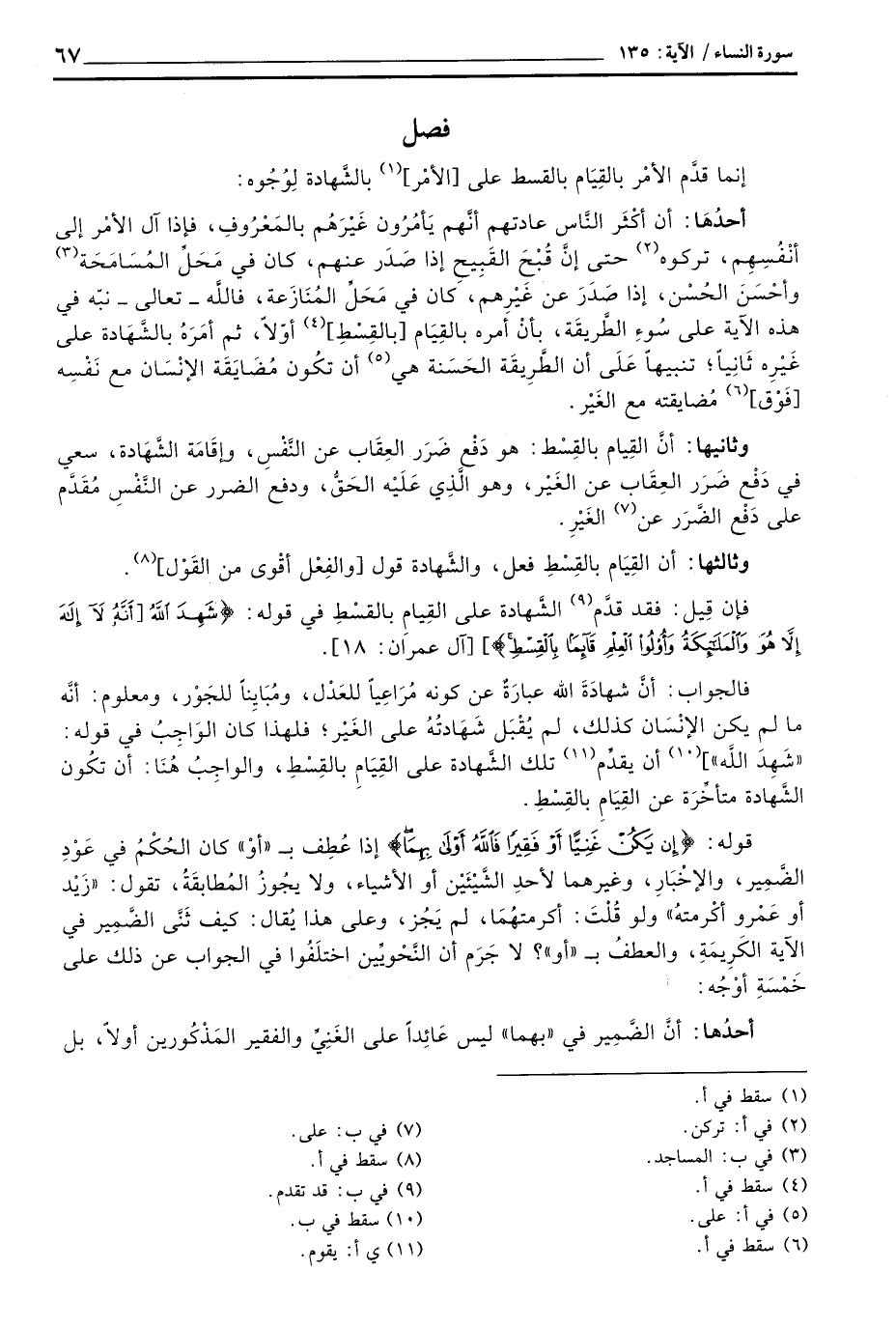 أحدُهَا: أن أكْثَر النَّاس عادتهم أنَّهم يَأمُرُون غَيْرَهُم بالمَعْرُوفِ، فإذا آل الأمْر إلى أنْفُسِهِم، تركوه حتى إنَّ قُبْحَ القَبِيحِ إذا صَدَر عنهم، كان في مَحَلِّ المُسَامَحَة وأحْسَنَ الحُسْن، إذا صَدَرَ عن غَيْرِهم، كان في مَحَلِّ المُنَازَعة، فاللَّه - تعالى - نبّه في هذه الآية على سُوءِ الطَّرِيقَة، بأنْ أمره بالقِيَام [بالقِسْطِ] أوّلاً، ثم أمَرَهُ بالشَّهَادة على غَيْرِه ثَانِياً، تنبيهاً عَلَى أن الطَّرِيقَة الحَسَنة هي أن تكُون مُضَايَقَة الإنْسَان مع نَفْسِه [فَوْق] مُضايقته مع الغَيْر.