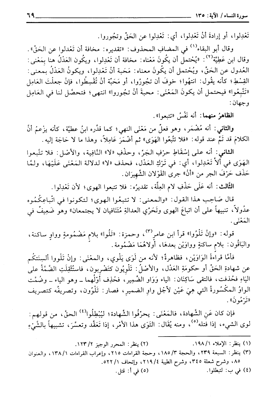 وقال أبو البقاء في المضافِ المحذوف: «تقديره: مخافة أن تَعْدلوا عن الحَقِّ» . وقال ابن عَطِيَّة: «يُحْتمل أن يكُونَ مَعْناه: مخافة أن تَعْدِلوا، ويكُون العَدْلُ هنا بِمَعْنى: العُدول عن الحَقِّ، ويُحْتمل أن يكُونَ معناه: مَحَبة أنْ تُقْسِطُوا، فإنْ جعلْتَ العَامِل» تَتَّبِعُوا «فيحتمل أن يكونَ المَعْنَى: محبةَ أنْ تجُوروا» انتهى؛ فتحصَّل لنا في العَامِل وجهان: