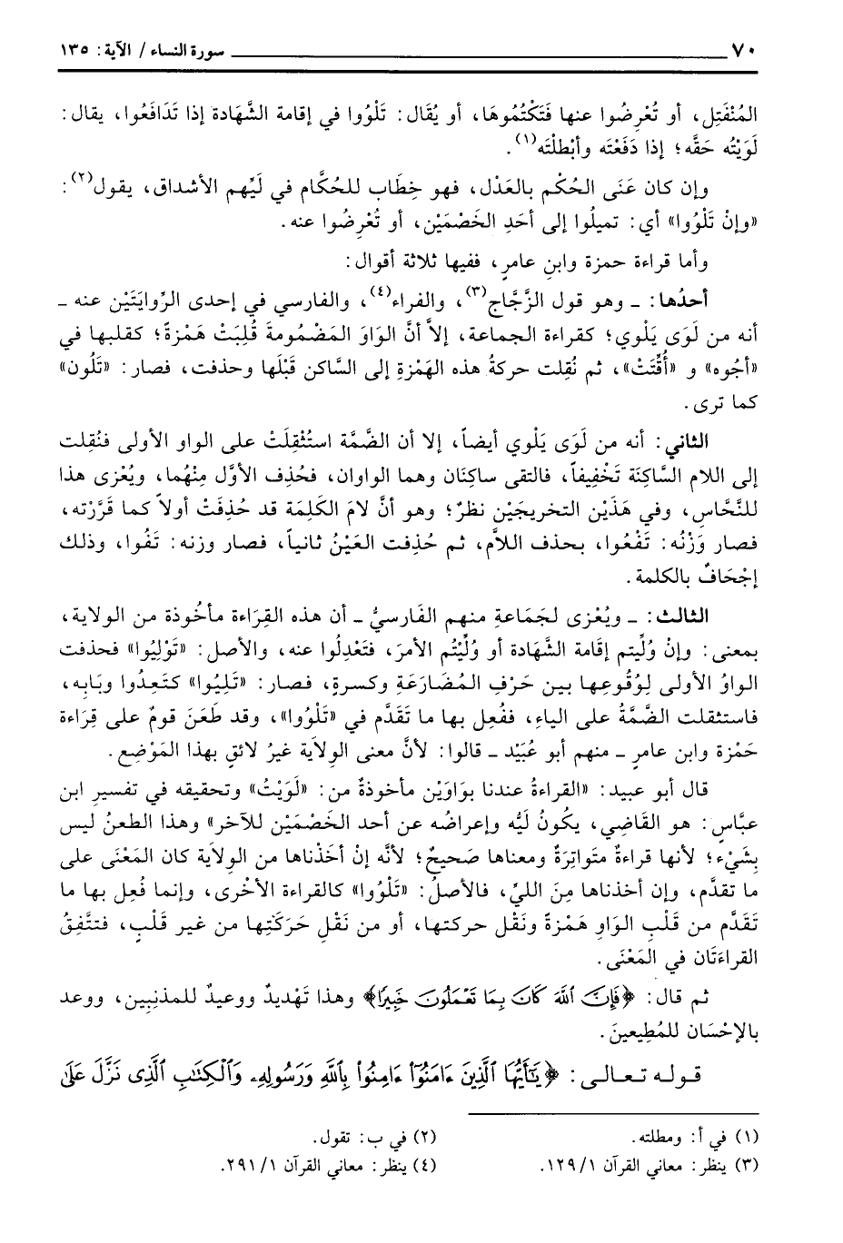 قال أبو عبيد: «القراءةُ عندنا بوَاوَيْن مأخوذةٌ من:» لَوَيْتُ «وتحقيقه في تفسيرِ ابن عبَّاسٍ: هو القَاضِي، يكُونُ لَيُّه وإعراضُه عن أحد الخَصْمَيْن للآخر» وهذا الطعنُ ليس بِشَيْء؛ لأنها قراءةٌ متَواتِرَةٌ ومعناها صَحيحٌ؛ لأنَّه إن أخَذْناها من الوِلاَية كان المَعْنَى على ما تقدَّم، وإن أخذناها مِنَ الليِّ، فالأصلُ: «تَلْوُوا» كالقراءة الأخْرى، وإنما فُعِل بها ما تَقَدَّم من قَلْبِ الوَاوِ هَمْزةً ونَقْل حركتها، أو من نَقْلِ حَرَكَتِها من غير قَلْبٍ، فتتَّفِقُ القراءَتَان في المَعْنَى.