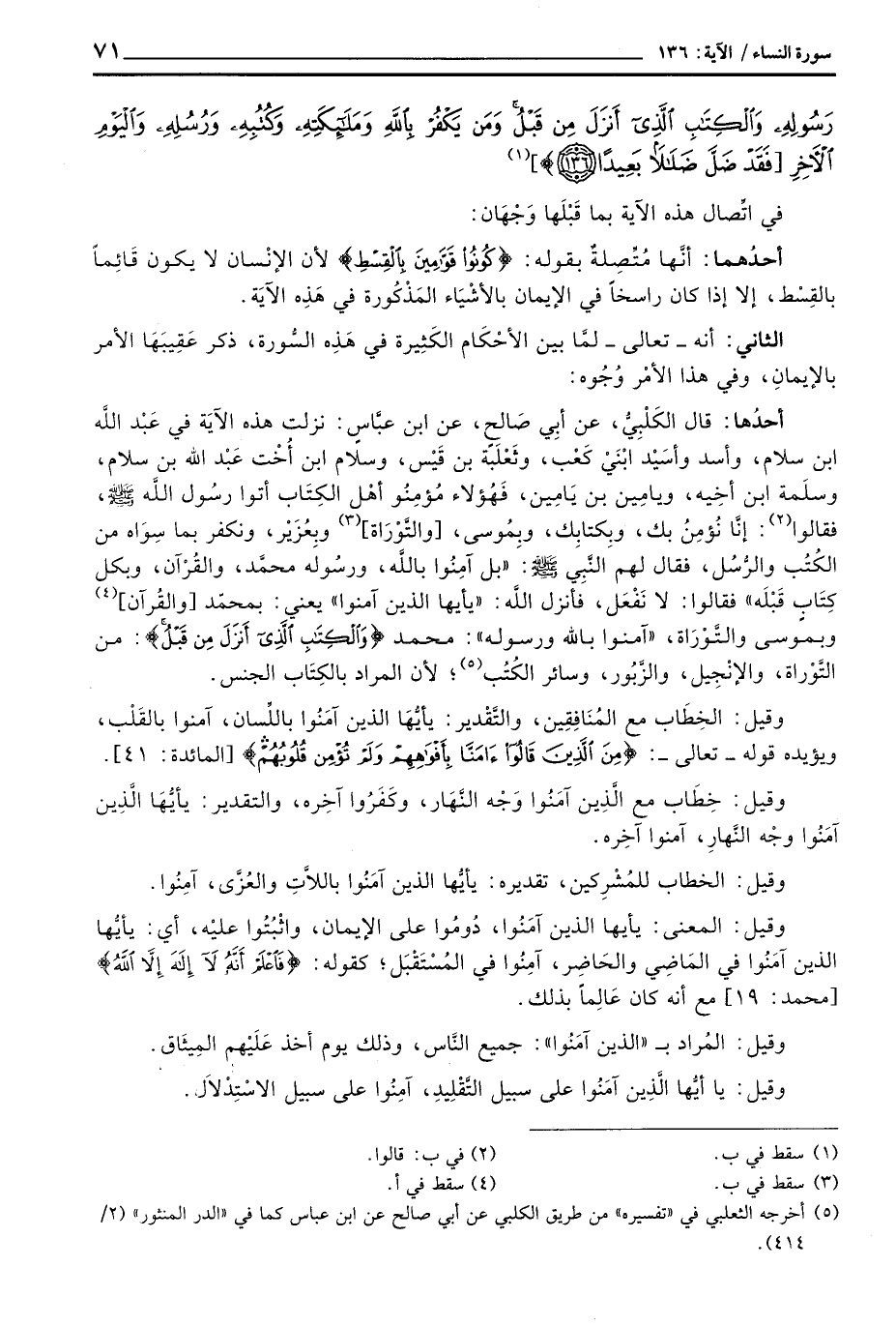 أحدُها: قال الكَلْبِيُّ، عن أبِي صَالح، عن ابن عبَّاسٍ: نزلت هذه الآيَة في عَبْد اللَّه ابن سلام، وأسد وأسَيْد ابْنَيْ كَعْب، وثَعْلَبَة بن قَيْس، وسلام ابن أُخْت عَبْد الله بن سلام، وسلَمة ابن أخِيه، ويامِين بن يَامِين، فَهُؤلاء مُؤمِنُوا أهْل الكِتَاب أتوا رسُول اللَّه صَلَّى اللَّهُ عَلَيْهِ وَسَلَّم َ، فقالوا: إنَّا نُؤمِنُ بك، وبِكتابِك، وبِمُوسى، [والتَّوْرَاة] وبِعُزَيْر، ونكفر بما سِوَاه من الكُتُب والرُّسُل، فقال لهم النَّبِي صَلَّى اللَّهُ عَلَيْهِ وَسَلَّم َ: «بل آمِنُوا باللَّه، ورسُوله محمَّد، والقُرْآن، وبكل كِتَابٍ قَبْلَه» فقالوا: لا نَفْعَل «، فأنزل اللَّه: {يَا أَيُّهَا الذين آمَنُواْ} يعني: بمحمّد [والقُرآن] وبموسى والتَّوْرَاة، {آمنوا بالله ورسوله} : محمد {والكتاب الذي أَنَزلَ مِن قَبْلُ} : من التَّوْراة، والإنْجِيل، والزَّبُور، وسائر الكُتُب؛ لأن المراد بالكِتَاب الجنس.