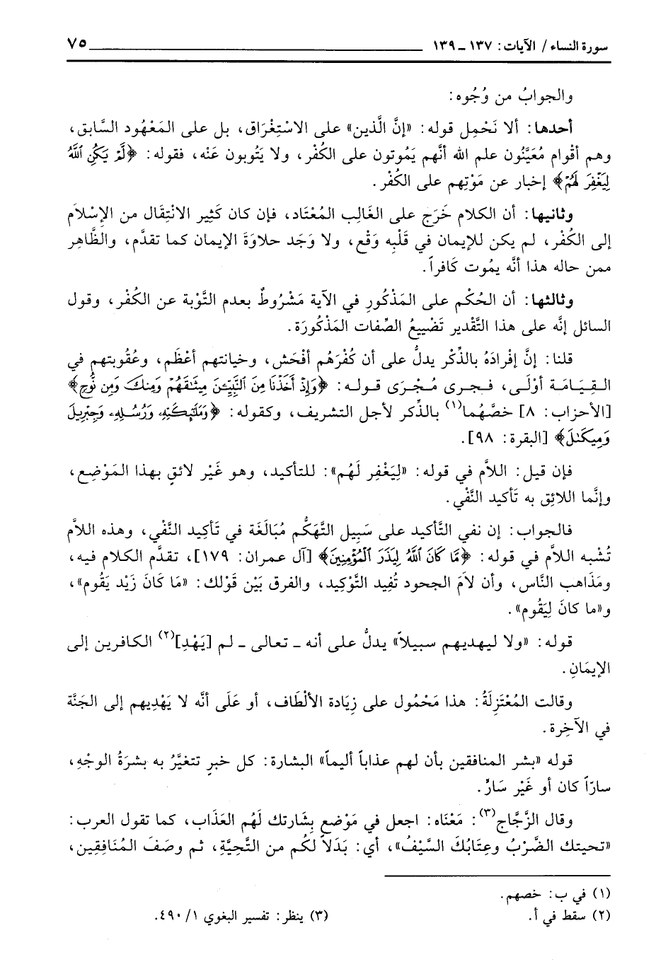 أحدها: ألا نَحْمِل قوله: «إنَّ الَّذين» على الاسْتِغْرَاق، بل على المَعْهُود السَّابق، وهم أقْوام مُعَيَّنُون علم الله أنَّهم يَمُوتون على الكُفْر، ولا يَتُوبون عَنْه، فقوله: {لَّمْ يَكُنْ الله لِيَغْفِرَ لَهُمْ} إخبار عن مَوْتِهِم على الكُفْر.