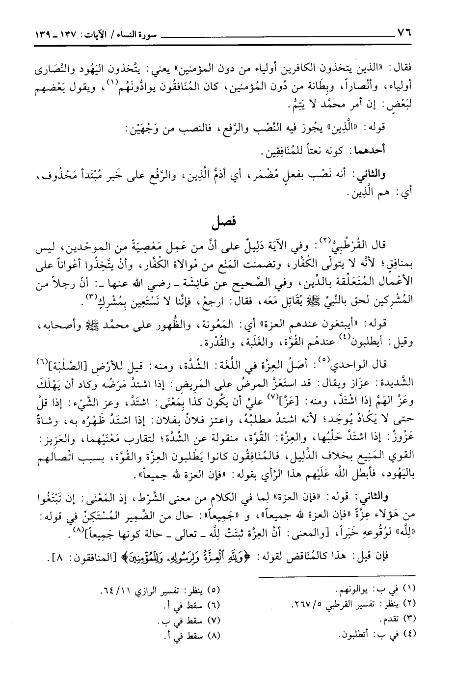 قوله: {أيبتغون عندهم العزة} أي: المَعُونة، والظُّهور على محمَّد صَلَّى اللَّهُ عَلَيْهِ وَسَلَّم َ وأصحابه، وقيل: أيطلبون عندهُم القُوَّة، والغَلَبة، والقُدْرة.