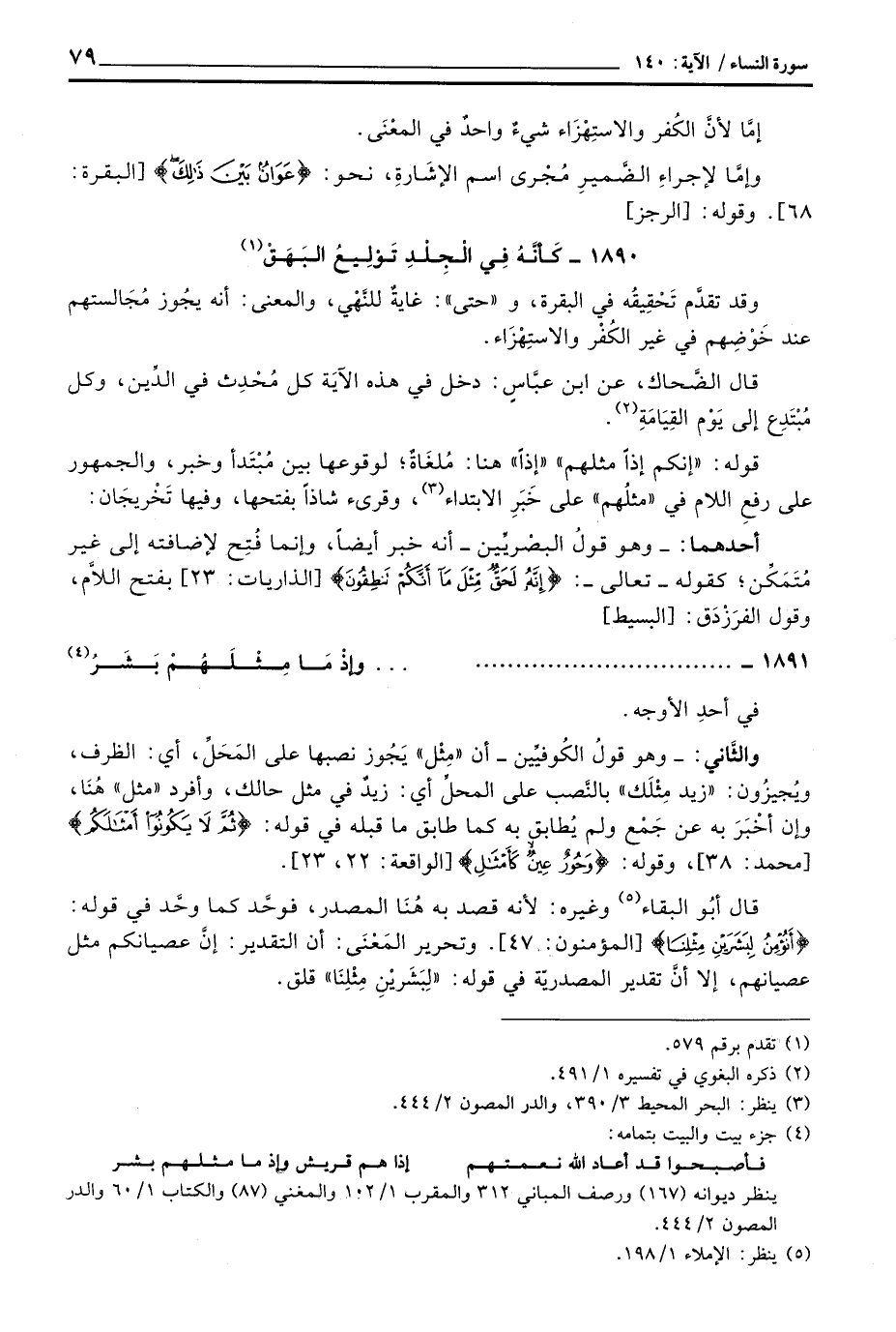 1890 - كَأنَّهُ فِي الجِلْدِ تَوْلِيعُ البَهَق ... وقد تقدَّم تَحْقِيقُه في البقرة، و «حتى» : غايةٌ للنَّهْي، والمعنى: أنه يجُوز مُجَالستهم عند خَوْضِهم في غير الكُفْر والاستِهْزَاء.