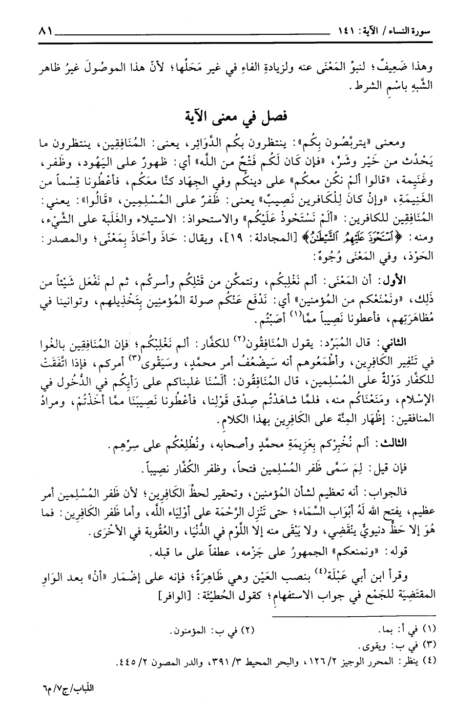 ومعنى «يتربَّصُون بِكُم» : ينتظرون بكُم الدَّوَائِر، يعنى: المُنَافِقِين، ينتظرون ما يَحْدُث من خَيْر وشَرٍّ، {فَإِن كَانَ لَكُمْ فَتْحٌ مِّنَ الله} أي: ظهورٌ على اليَهُود، وظَفر، وغَنَيِمة، {قالوا أَلَمْ نَكُنْ مَّعَكُمْ} على دينكُم وفي الجِهَاد كنَّا معَكُم، فأعْطُونا قِسْماً من الغَنِيمَةِ، {وَإِن كَانَ لِلْكَافِرِينَ نَصِيبٌ} يعني: ظَفرٌ على المُسْلِمِين، «قَالُوا» : يعني: المُنَافِقِين للكافرين: {أَلَمْ نَسْتَحْوِذْ عَلَيْكُمْ} والاستحواذ: الاستيلاء والغَلَبة على الشَّيْء، ومنه: {استحوذ عَلَيْهِمُ الشيطان} [المجادلة: 19] ، ويقال: حَاذَ وأحَاذَ بِمَعْنًى؛ والمصدر: الحَوْذ، وفي المَعْنَى وُجُوهٌ: