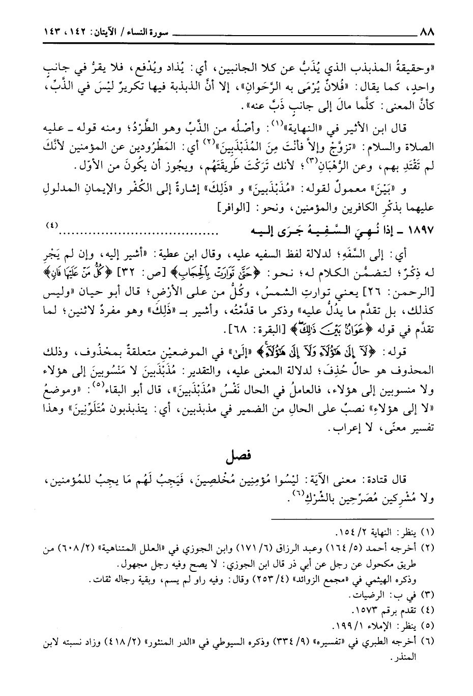 قوله: {لاَ إلى هؤلاء وَلاَ إِلَى هؤلاء} » إِلَى «في الموضعيْنِ متعلقةٌ بمحْذُوف، وذلك المحذوف هو حالٌ حُذِفَ؛ لدلالة المعنى عليه، والتقدير: مُذَبْذَبينَ لا مَنْسُوبينَ إلى هؤلاء ولا منسوبين إلى هؤلاء، فالعاملُ في الحال نَفْسُ» مُذَبْذَبينَ «، قال أبو البقاء:» وموضعُ {لا إلى هؤلاءِ} نصبٌ على الحالِ من الضمير في مذبذبين، أي: يتذبذبون مُتَلَوِّنينَ «وهذا تفسير معنًى، لا إعراب.
